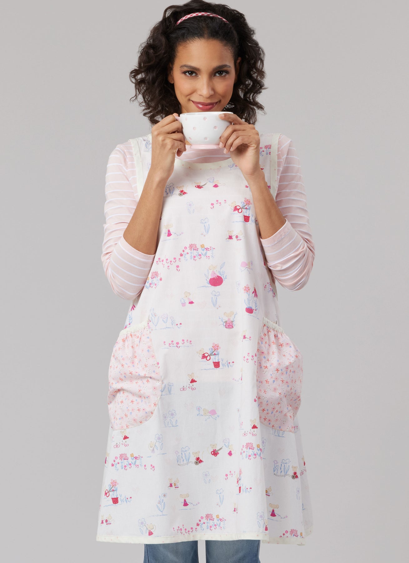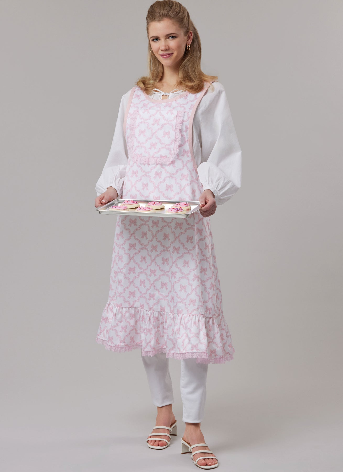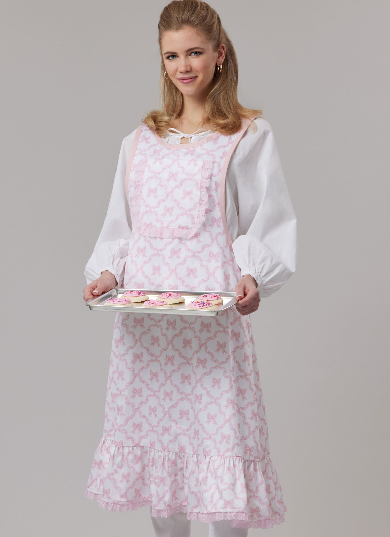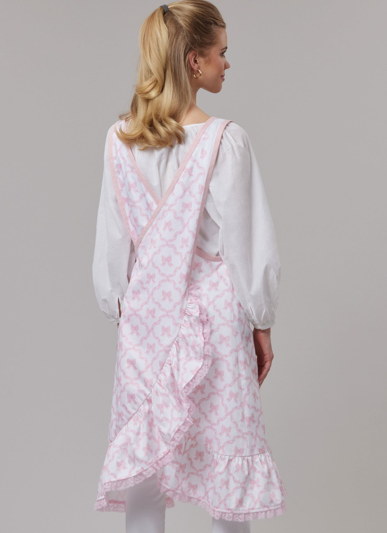 Schürzen im Landhausstil mit gekreuztem Rücken haben einen Rundhalsausschnitt, niedrige Armausschnitte, kontrastierende Einfassungen aus Stoff oder Schrägband und können mit kontrastierenden gerafften runden Taschen oder aufgesetzten Taschen mit Spitzenbesatz auf der Vorderseite hergestellt werden. Knielange Schürzen haben kontrastfarbene oder mit Schrägband eingefasste Säume. Wadenlange Schürzen haben eine Rüsche am Saum; die Rüsche kann aus einem Kontraststoff oder einem passenden Stoff mit Spitzenbesatz bestehen. Siehe Umschlag für weitere Informationen.