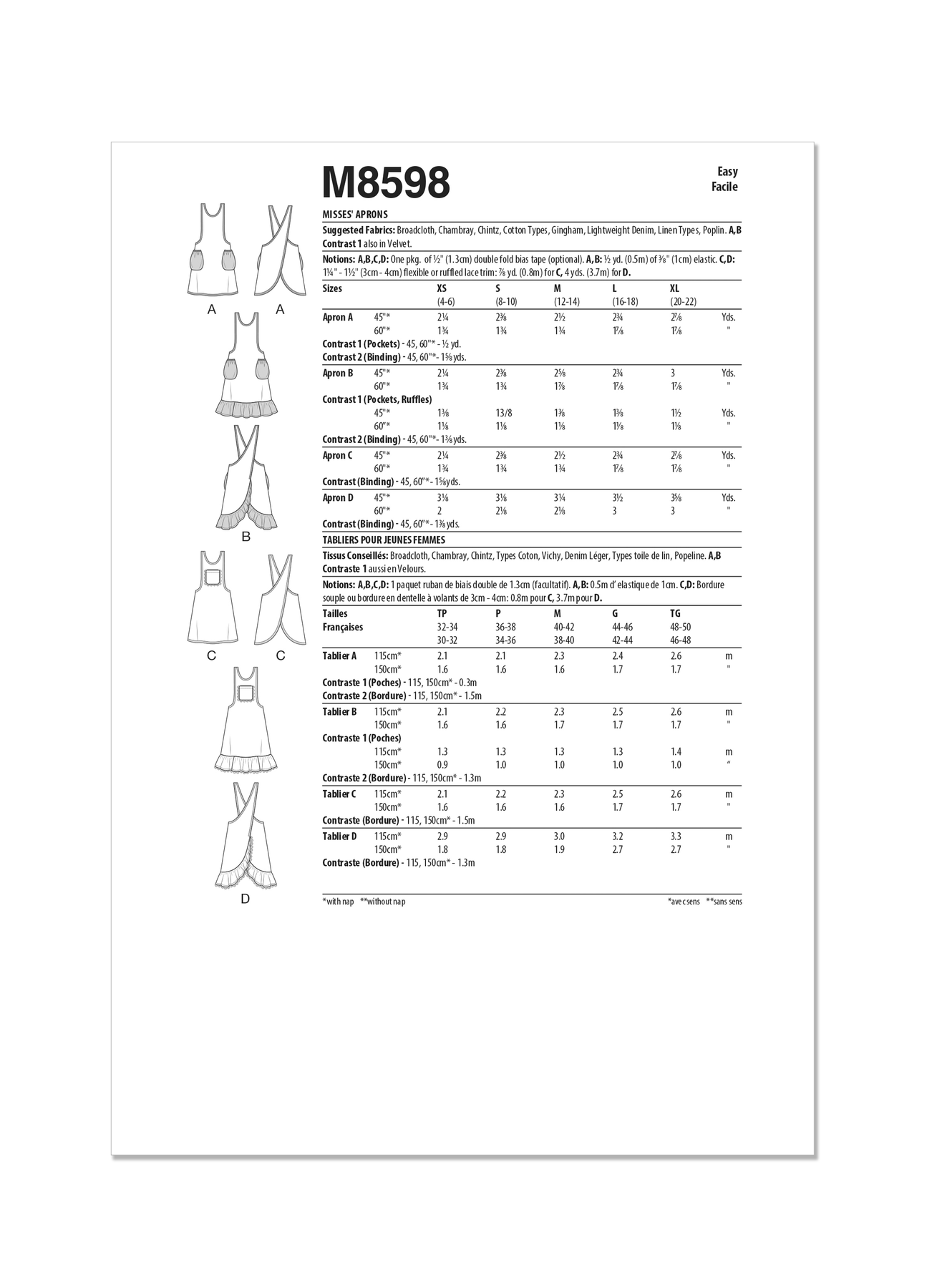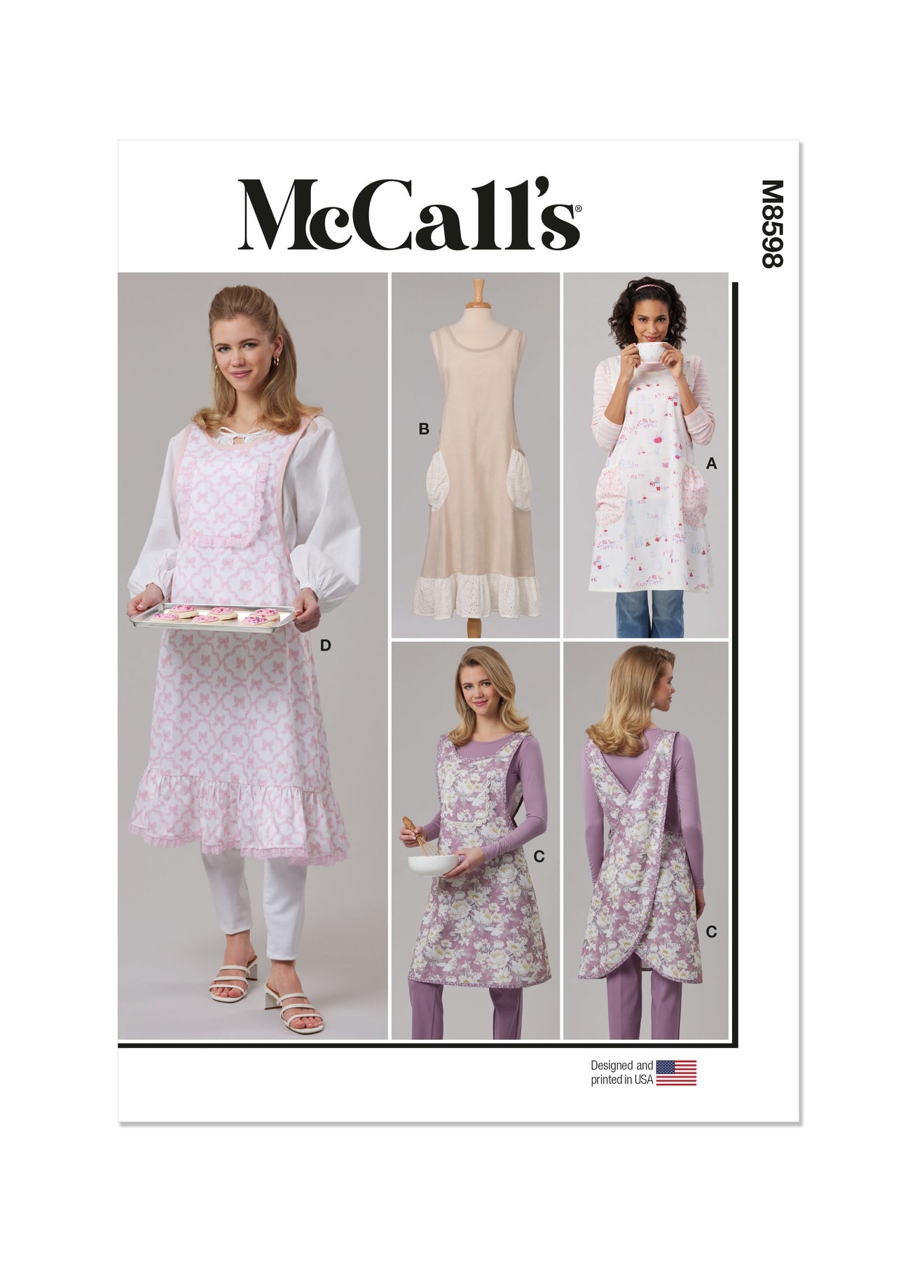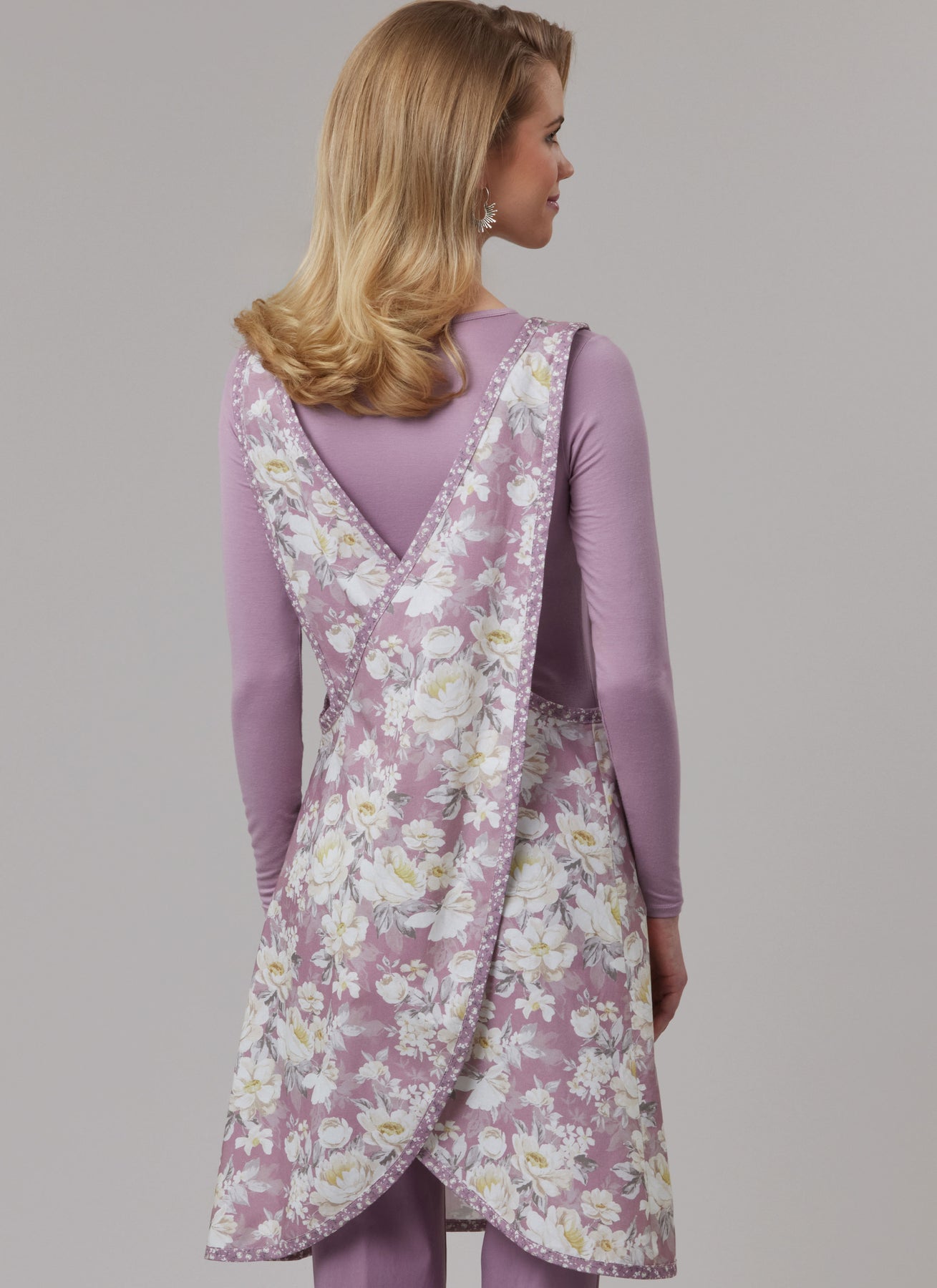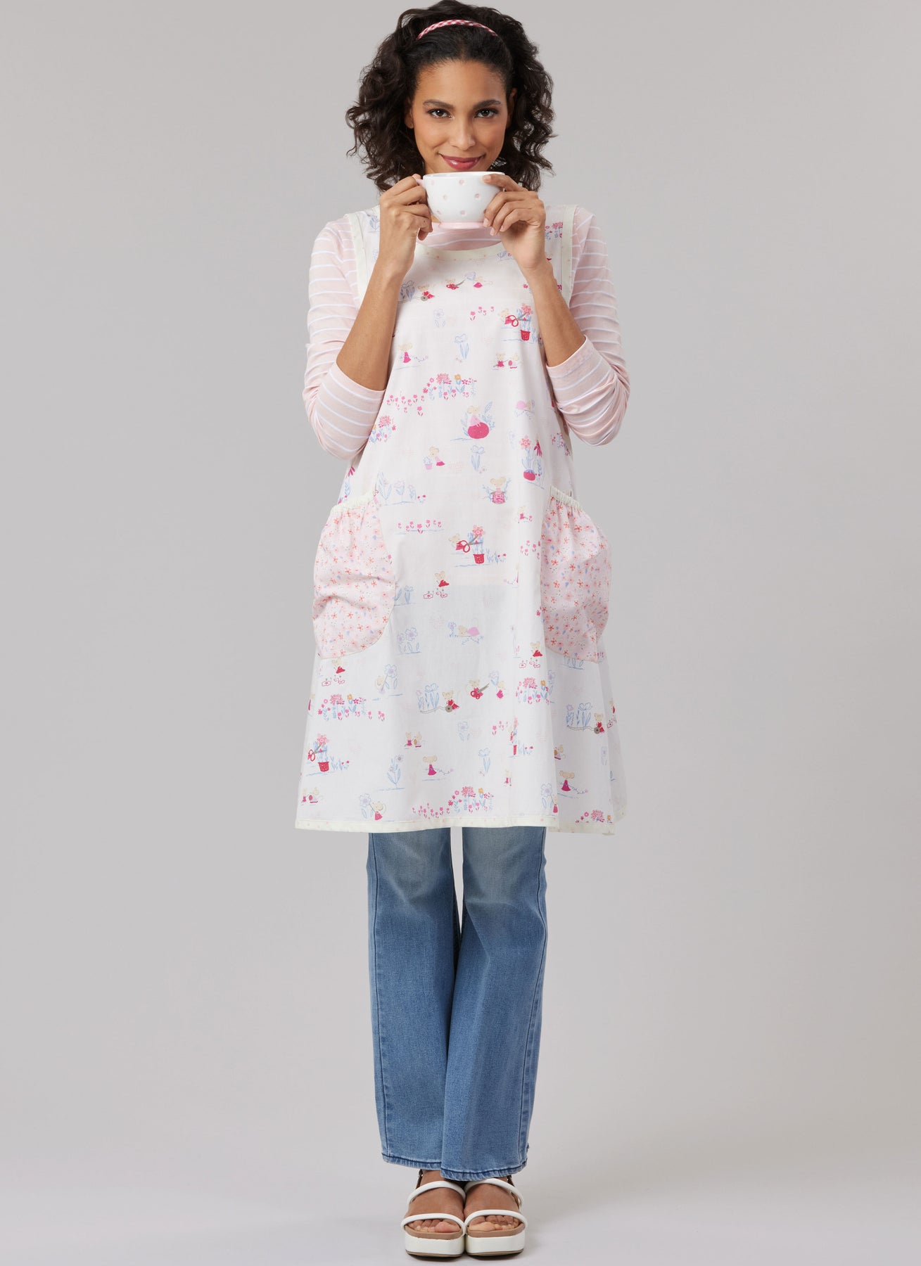 Schürzen im Landhausstil mit gekreuztem Rücken haben einen Rundhalsausschnitt, niedrige Armausschnitte, kontrastierende Einfassungen aus Stoff oder Schrägband und können mit kontrastierenden gerafften runden Taschen oder aufgesetzten Taschen mit Spitzenbesatz auf der Vorderseite hergestellt werden. Knielange Schürzen haben kontrastfarbene oder mit Schrägband eingefasste Säume. Wadenlange Schürzen haben eine Rüsche am Saum; die Rüsche kann aus einem Kontraststoff oder einem passenden Stoff mit Spitzenbesatz bestehen. Siehe Umschlag für weitere Informationen.