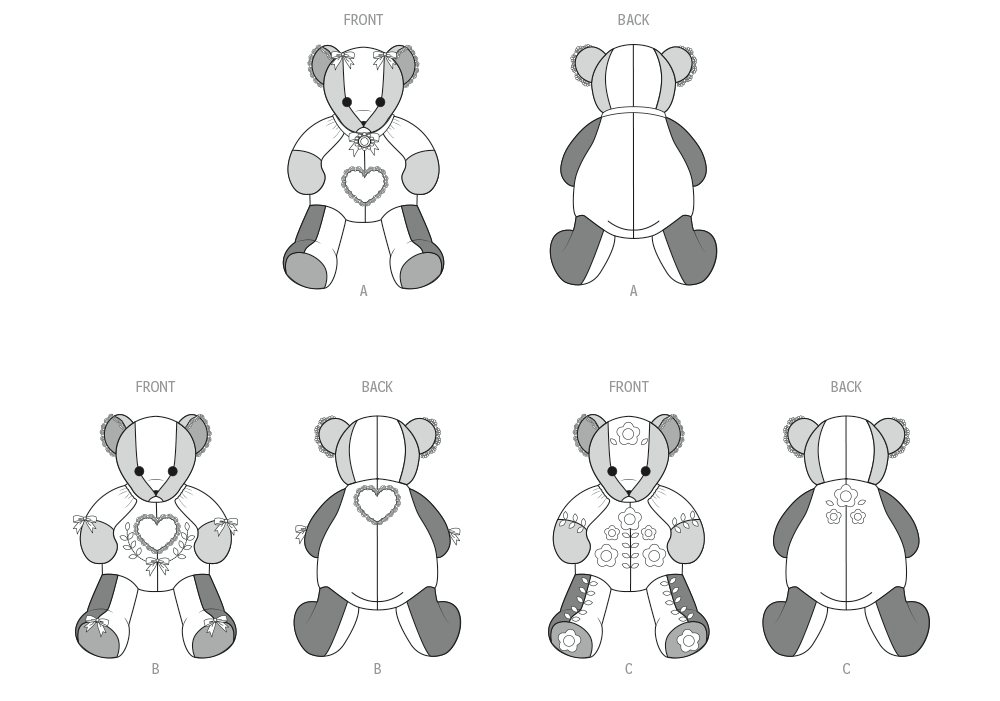 Die süßen 46 cm (18") großen Plüschbären sind mit aufwendigen Nähten versehen, so dass der Patchwork-Effekt entsteht. Alle Bären haben Sicherheitsaugen, Sicherheitsnasen und Ohren, die mit Spitzenbordüren oder Mini-Puffball-Bordüren verziert sind. Zu den Applikationsmöglichkeiten gehören eingefasste Herzen, Blätter mit gestickten Ranken und zweifarbige Blumen und Blätter. Bandschleifen an der Krawatte mit neuartigen Knopfverzierungen sorgen für den letzten Schliff. Siehe Umschlag für weitere Informationen.