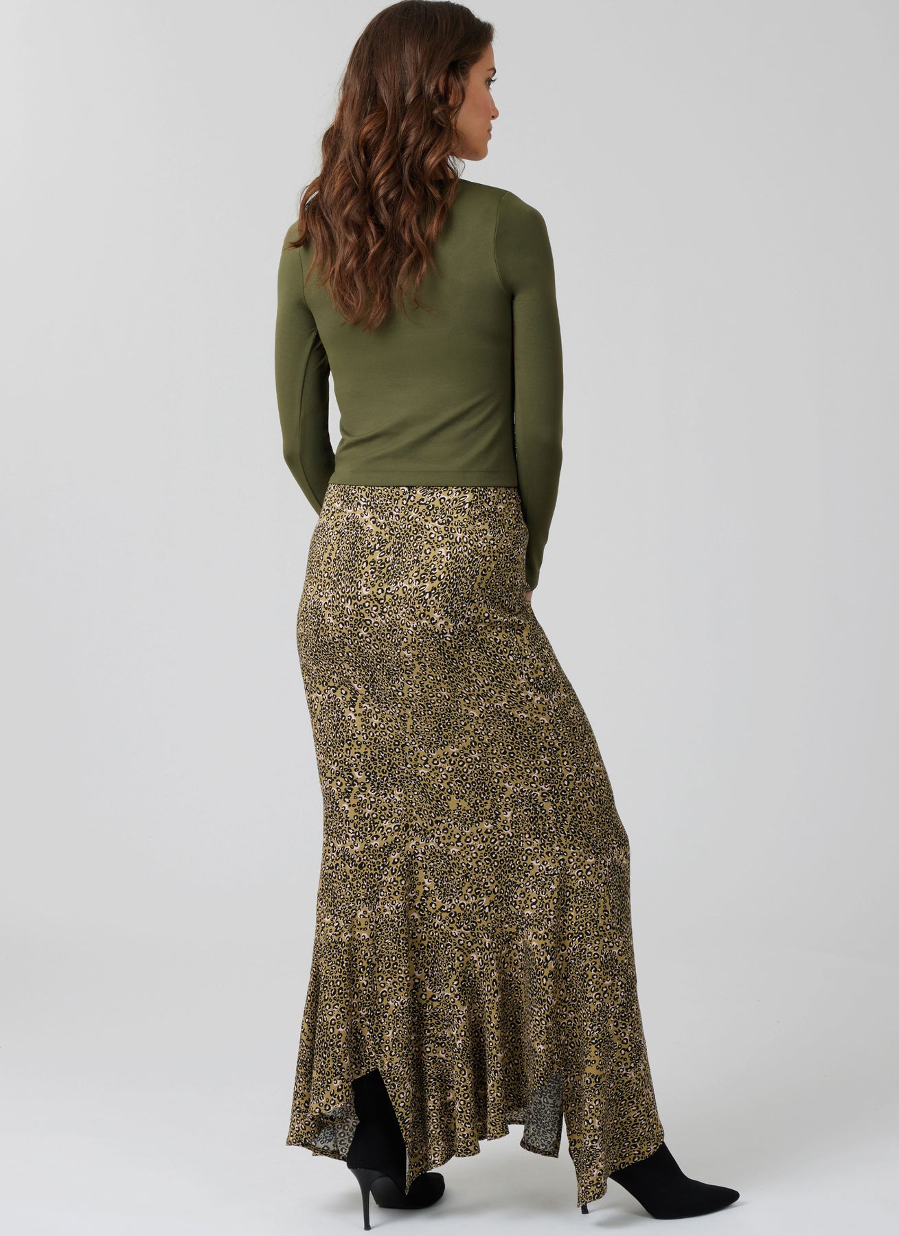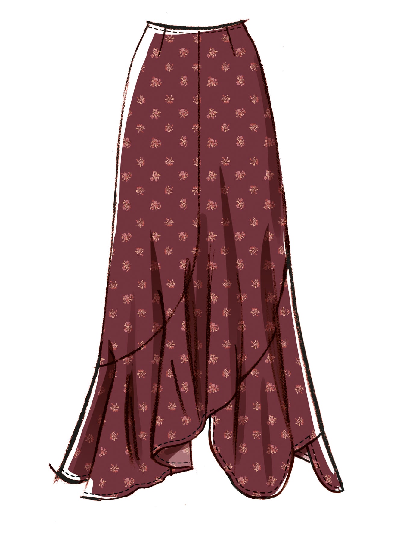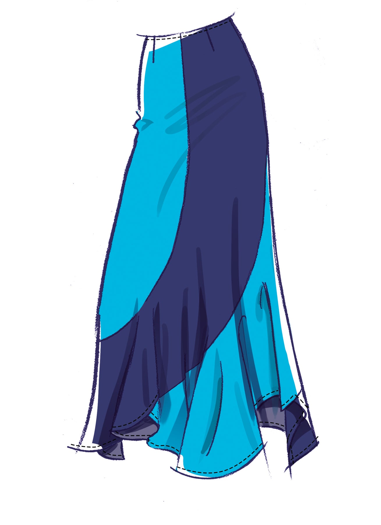 Die figurbetonten, knöchellangen Röcke haben ein gestuftes Design, einen Schrägsaum und einen verdeckten Reißverschluss. Der Rock in Variante B hat einen Kontrast. Der Rock in Variante C hat eine andere Saumform.