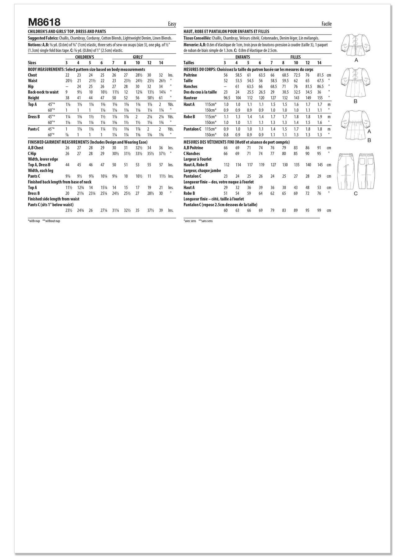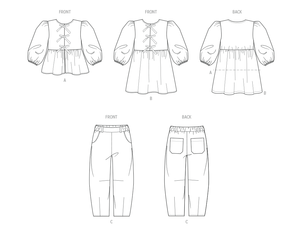 Mit dem McCall’s Schnittmuster M8618 nähst du ein liebevoll gestaltetes Set für Mädchen, bestehend aus Top, Kleid und Hose – perfekt für Alltag, Spiel und besondere Anlässe. Das Top und Kleid bezaubern mit 3/4-Puffärmeln mit Gummizug, Bindebändern vorne, einem U-Ausschnitt mit Schrägband und praktischen Druckknöpfen. Das Top erhält durch seinen Schößchen-Saum eine verspielte Note, während das Kleid an der Taille leicht gerafft ist und wunderschön fällt. Die zylinderförmige Hose ergänzt das Set perfekt: mit elastischem Bund, Gürtelschlaufen, Abnähern vorne und hinten sowie Taschen für kleine Schätze. Ein vielseitiges Projekt, das Mode und Bewegungsfreiheit vereint.