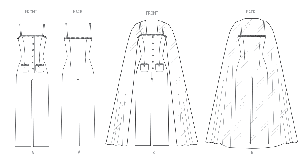 Jumpsuit für besondere Anlässe mit Spaghettiträgern und Kapuzenärmeln mit Knopfleiste, Prinzessnähten, aufgesetzten Taschen vorne und einem eingekauften Zierband.
