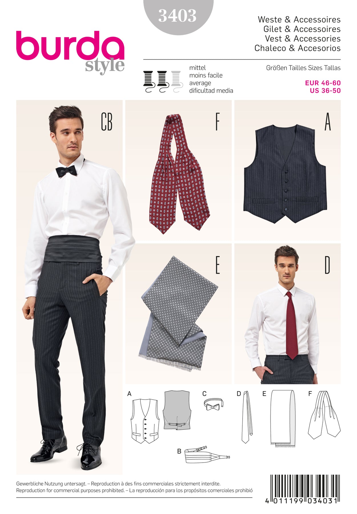 Herrenweste mit Pattentaschen, Futterrücken und Riegeln. Dazu die passenden Accessoires für jeden Anlass: Kummerbund, Fliege, Krawatte und 2 Schals.