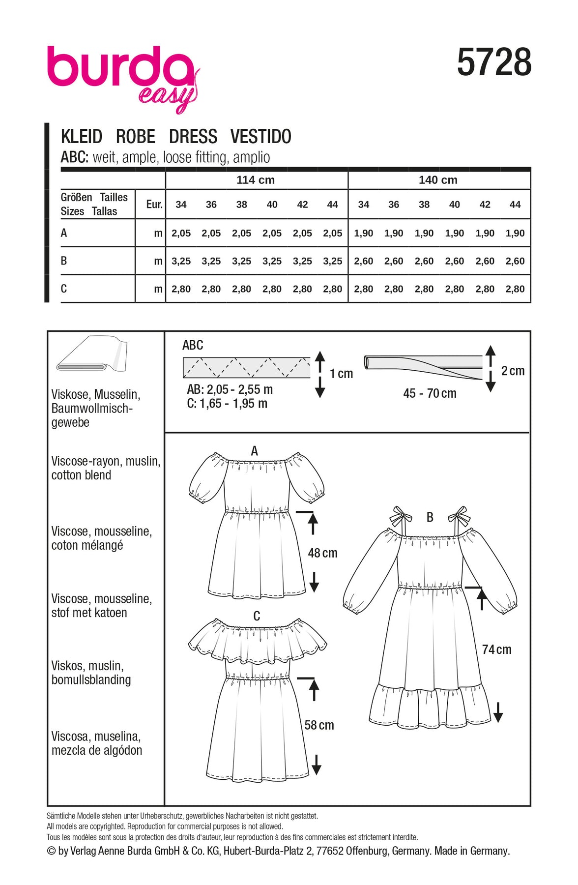 Burda Schnittmuster 5728 Damen Kleider Minikleid mit Gummizug, Midikleid mit Bindeträgern und ärmelloses Kleid mit Rüsche