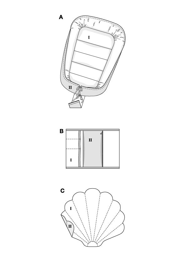 Stoffempfehlung:Baumwollstoffe, Waffelpikee, AC: auch Jersey, Sweatshirtstoffe, Fleece A: Füllwatte, Band, 1 cm breit: 2,80 m, Rest Klettband. AC: Dickes Volumenvlies. B: Vorgefalztes Einfassband, fertige Breite 1 cm: 1,20 m, Vlieseline Decovil I, 1 Reißverschluss, 22 cm lang, Gummiband, 5 cm breit: 60 cm