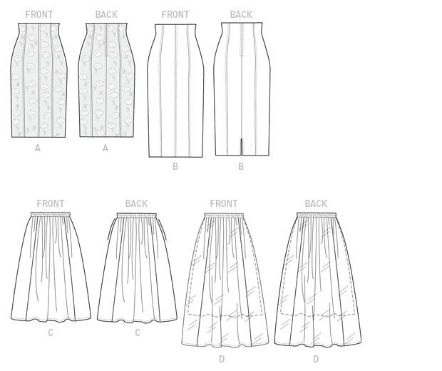 Der Rock hat unterschiedliche Nähte. A: Kontrastfarbiges Futter. B: Rückenschlitz. A, B: Halb tailliert, erhöhte Taille und Steppnähte. C: Seitentaschen. D: Angesetzter Slip. C, D: Elastischer Taillenbund und schmaler Saum. A, B: Nur für mäßig dehnbare Strickwaren.