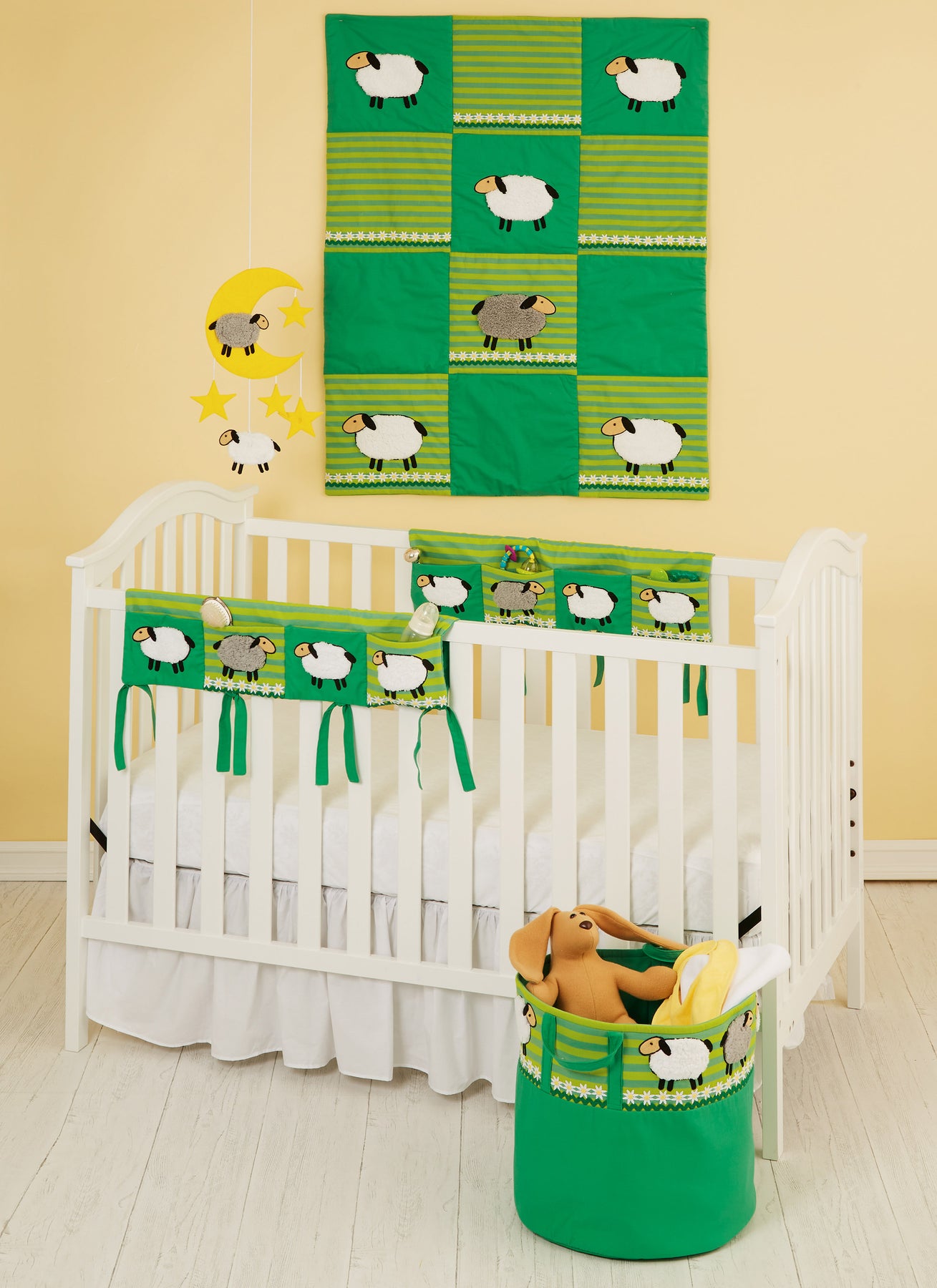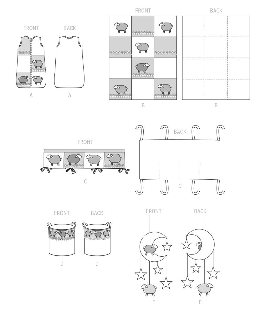 Entdecken Sie das charmante McCalls Schnittmuster M8299, das eine bezaubernde Auswahl an Accessoires bietet. Dieses Set umfasst einen applizierten, ärmellosen Schlafsack in Einheitsgröße mit süßem Schafmotiv, das Ihrem Baby Komfort und Wärme schenkt. Ergänzt wird das Angebot durch eine praktische Steppdecke, die sich ideal für unterwegs eignet, sowie einen vielseitigen Geländerschutz mit Taschen, die Stauraum für wichtige Utensilien bieten. Zusätzlich beinhaltet das Set einen stilvollen Korb und ein Mobile, die jedem Raum eine liebevolle Atmosphäre verleihen. Die Taschen sind mit Klappen versehen, die entweder mit aufgemalten oder applizierten Sternen oder Schnallenverschlüssen dekoriert sind, was dem Design eine besondere Note verleiht. Dieses Schnittmuster ist perfekt, um individuelle und funktionale Accessoires selbst zu gestalten, die sowohl praktisch als auch optisch ansprechend sind.