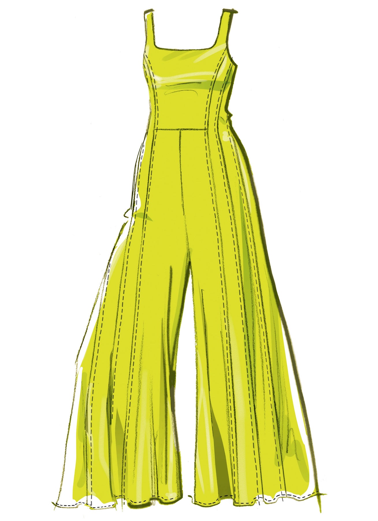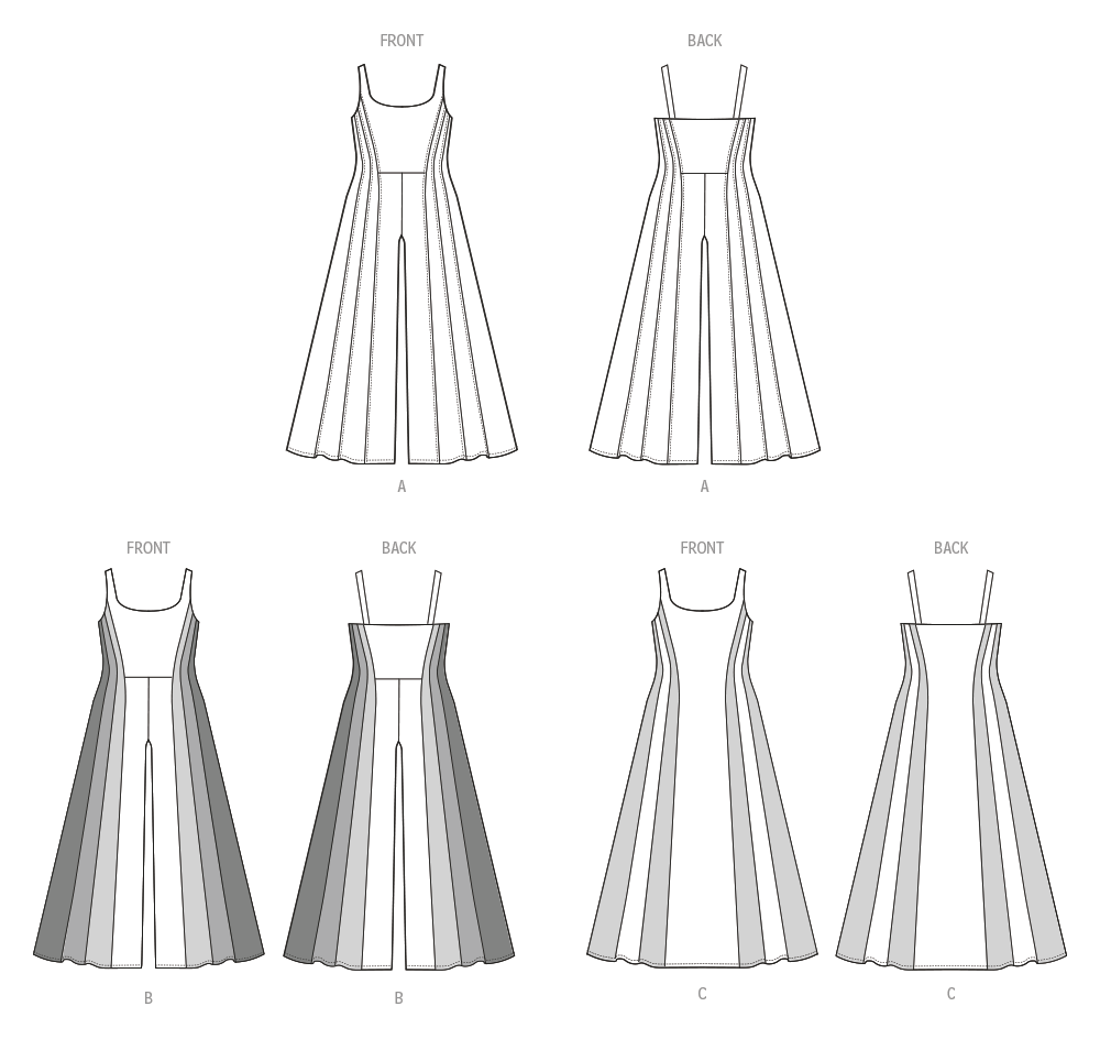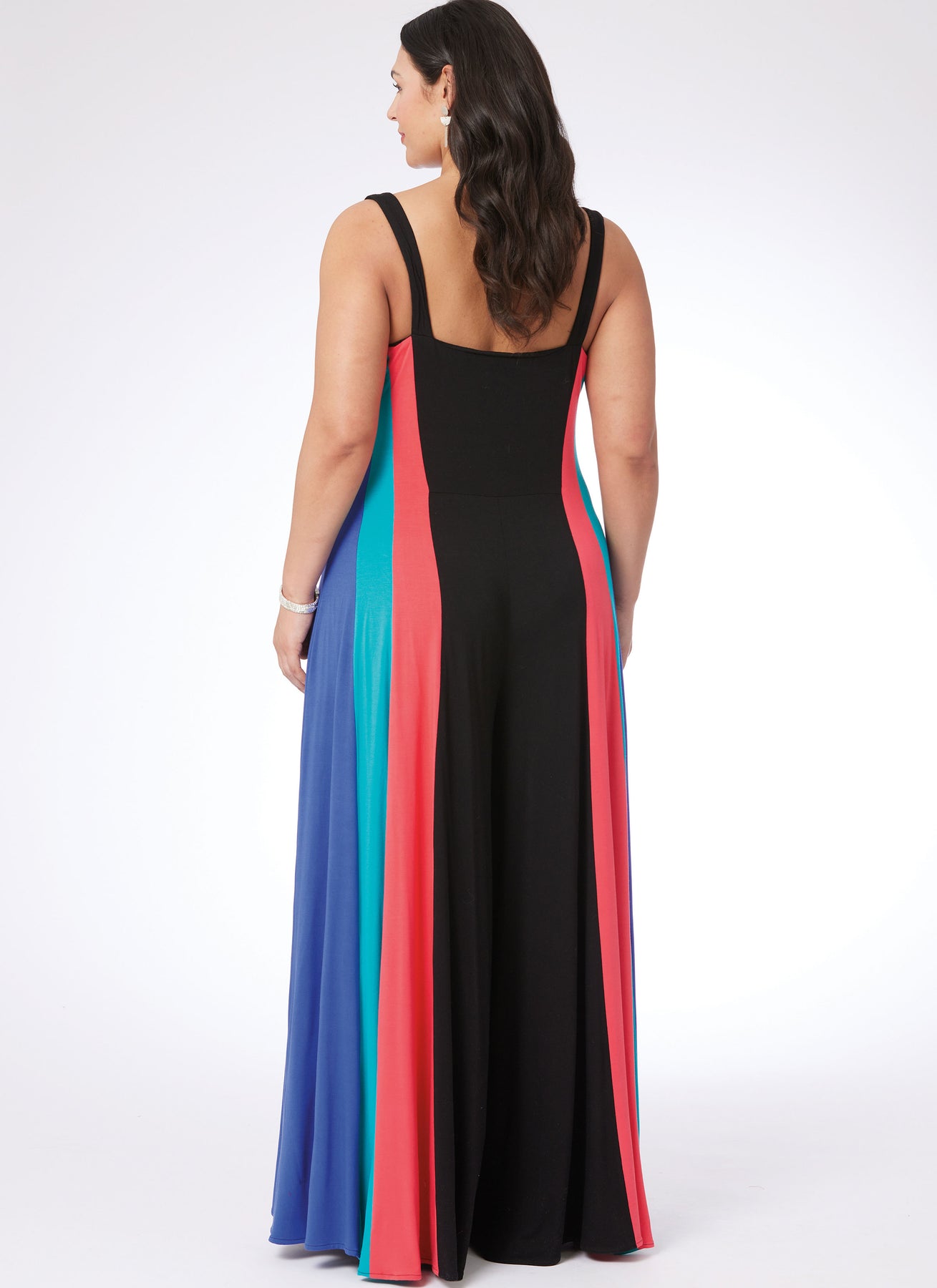 Die bodenlangen Jumpsuits und das Kleid haben verkleidete Nähte, 1"-Träger, Rundhalsausschnitt und Bügel-BH. Die Ansichten B und C haben Kontrasteinsätze.
