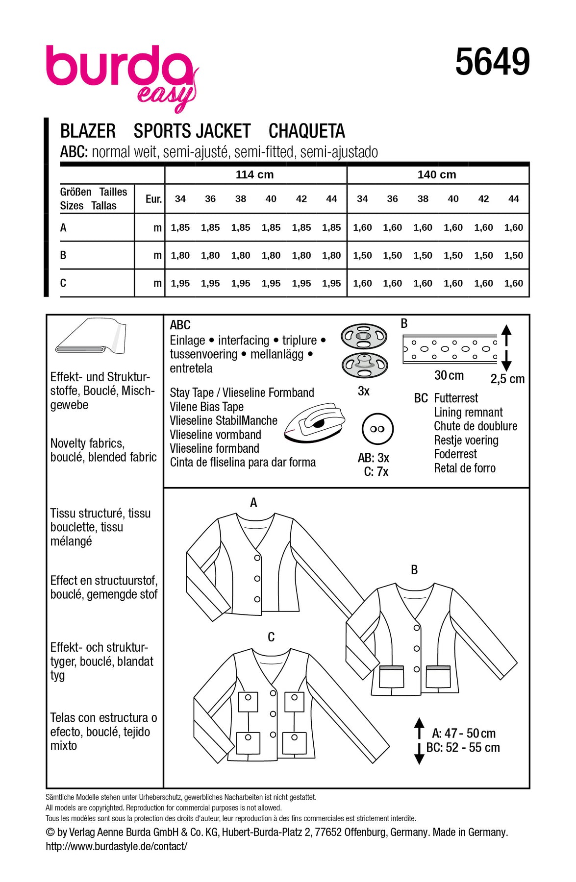 Mit dem Burda Schnittmuster 5649 entstehen drei stilvolle Bouclé-Jacken, die jedem Outfit einen Hauch von Eleganz verleihen. Klassische Details treffen auf moderne Silhouetten – ideal für feminine Business- und City-Looks.