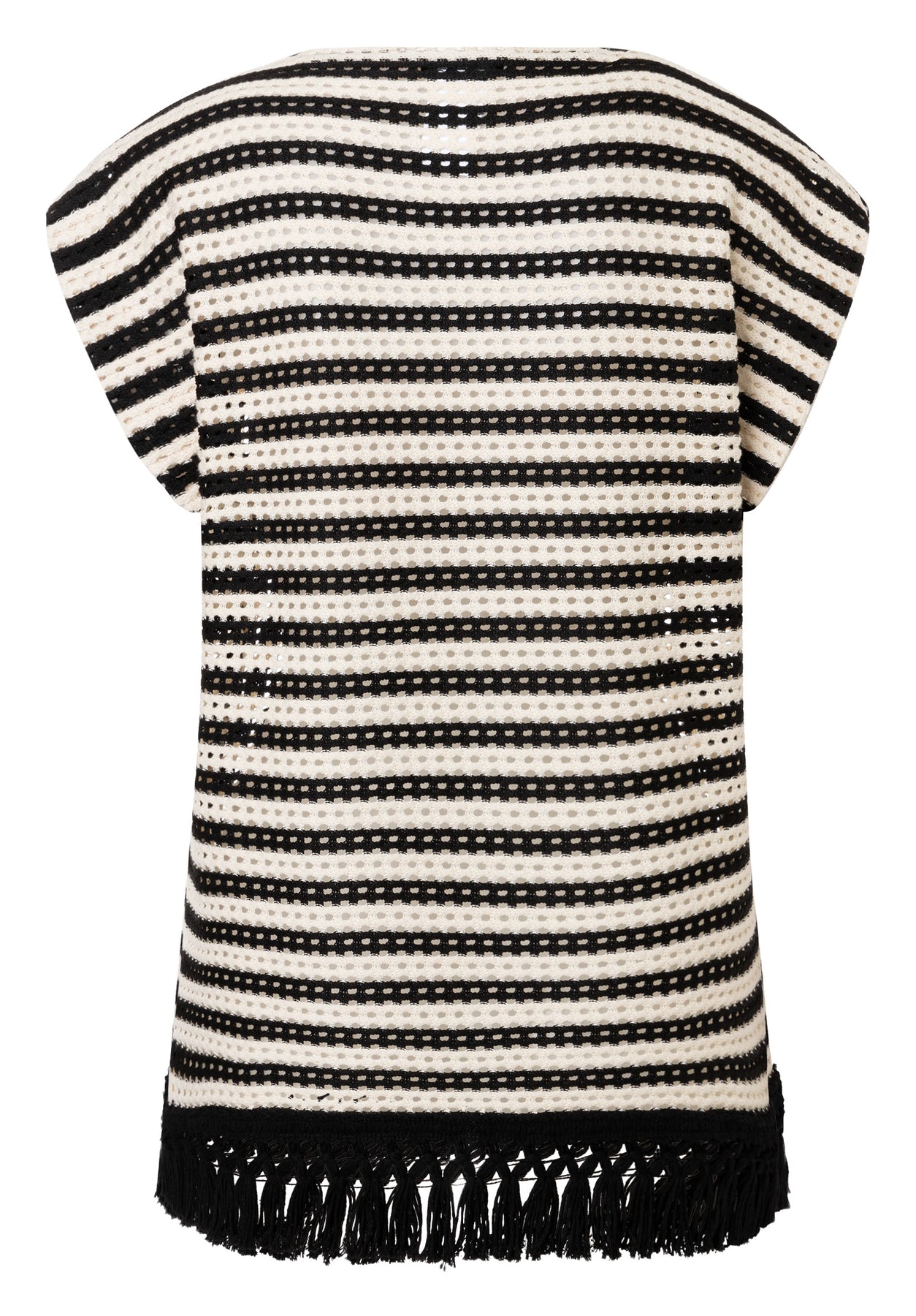 Variante B überzeugt durch luftig gestrickten Netzstoff, dekoratives Fransenband, angeschnittene Ärmel und einen U-Boot-Ausschnitt. Der Materialmix und die besonderen Details verleihen dem Modell eine individuelle, trendbewusste Ausstrahlung.