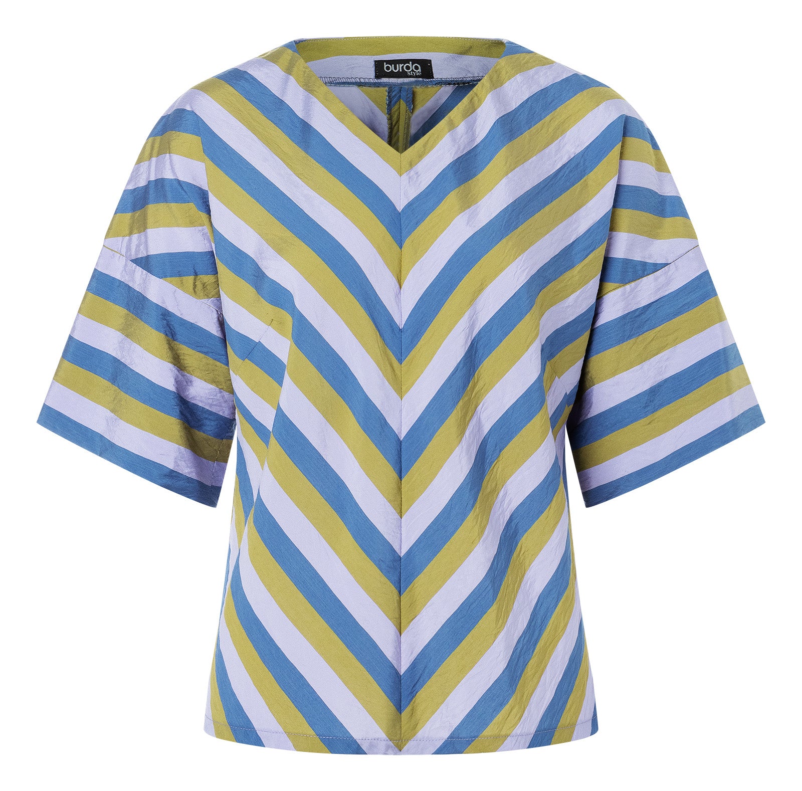 Variante A beeindruckt mit schräg zugeschnittenen Streifen, die exakt aufeinandergesetzt sind und so eine spannende Optik erzeugen. Überschnittene Schultern unterstreichen den lässigen Charakter, während die breiten Ärmelblenden im Fadenlauf für einen sauberen, strukturierten Abschluss sorgen.
