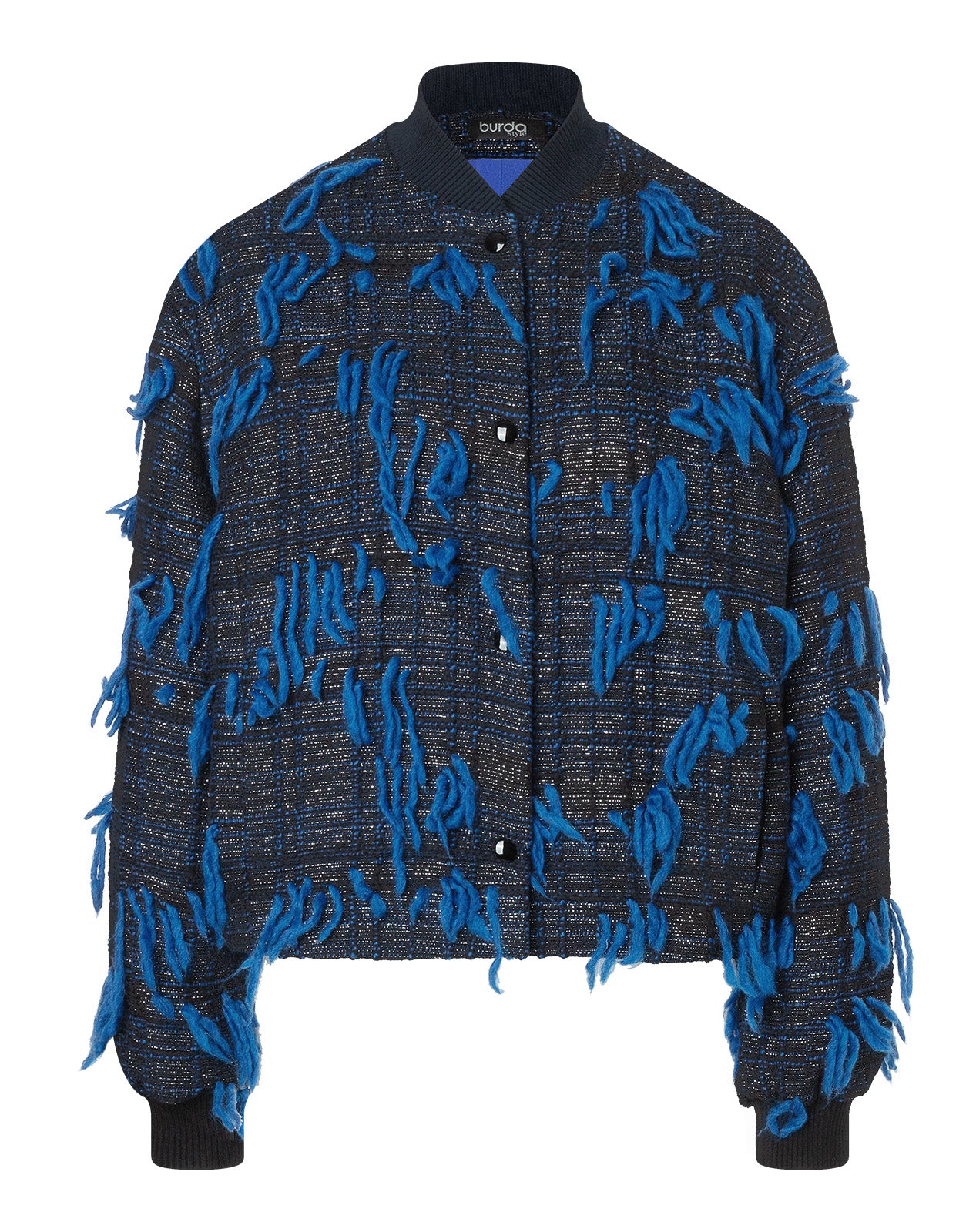Variante B verbindet sportlichen College-Charme mit Pariser Bouclé. Rippbündchen, Druckknöpfe und fransiger Stoff machen diese Weste zu einem modischen Highlight mit lässiger Note.