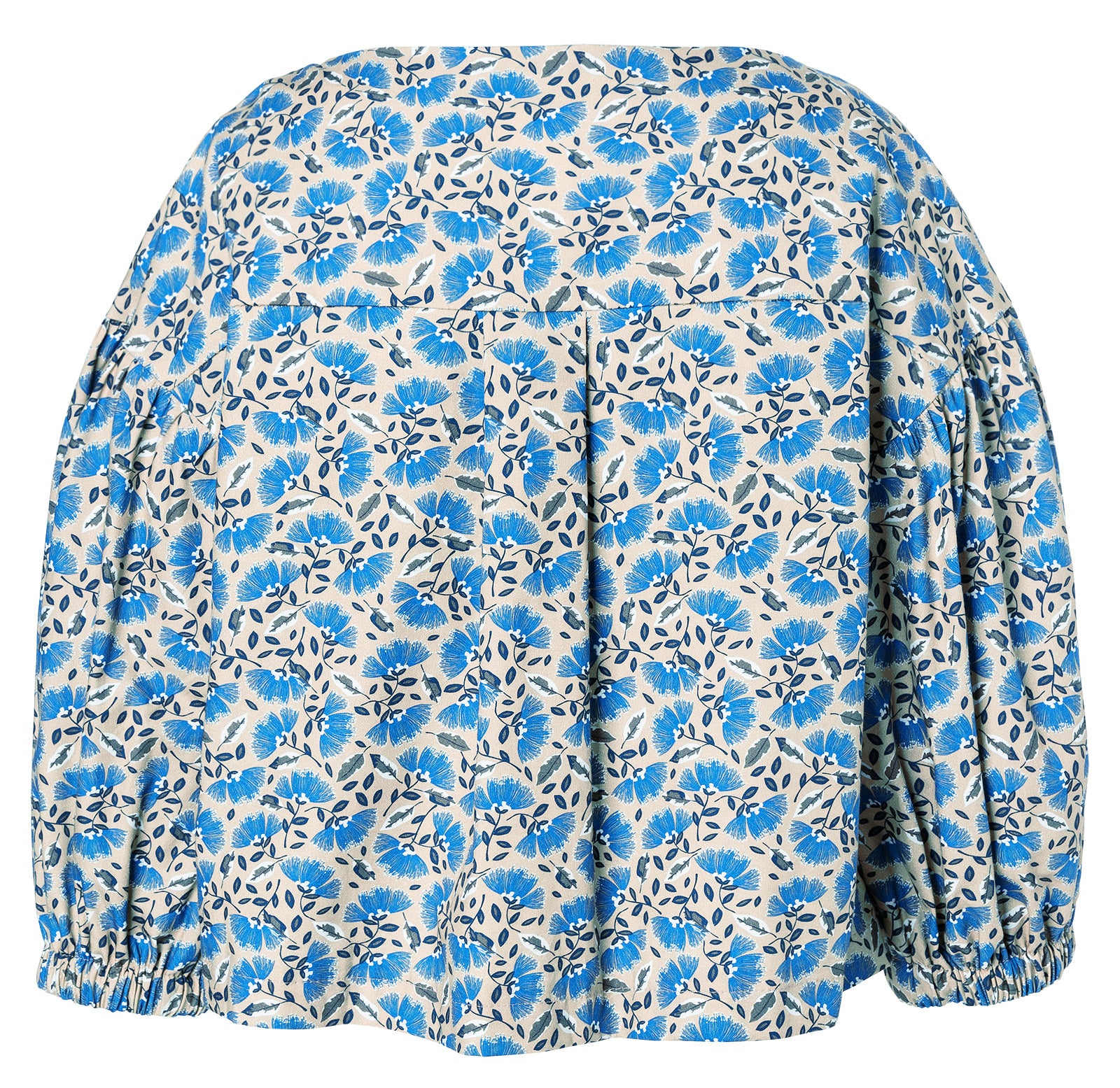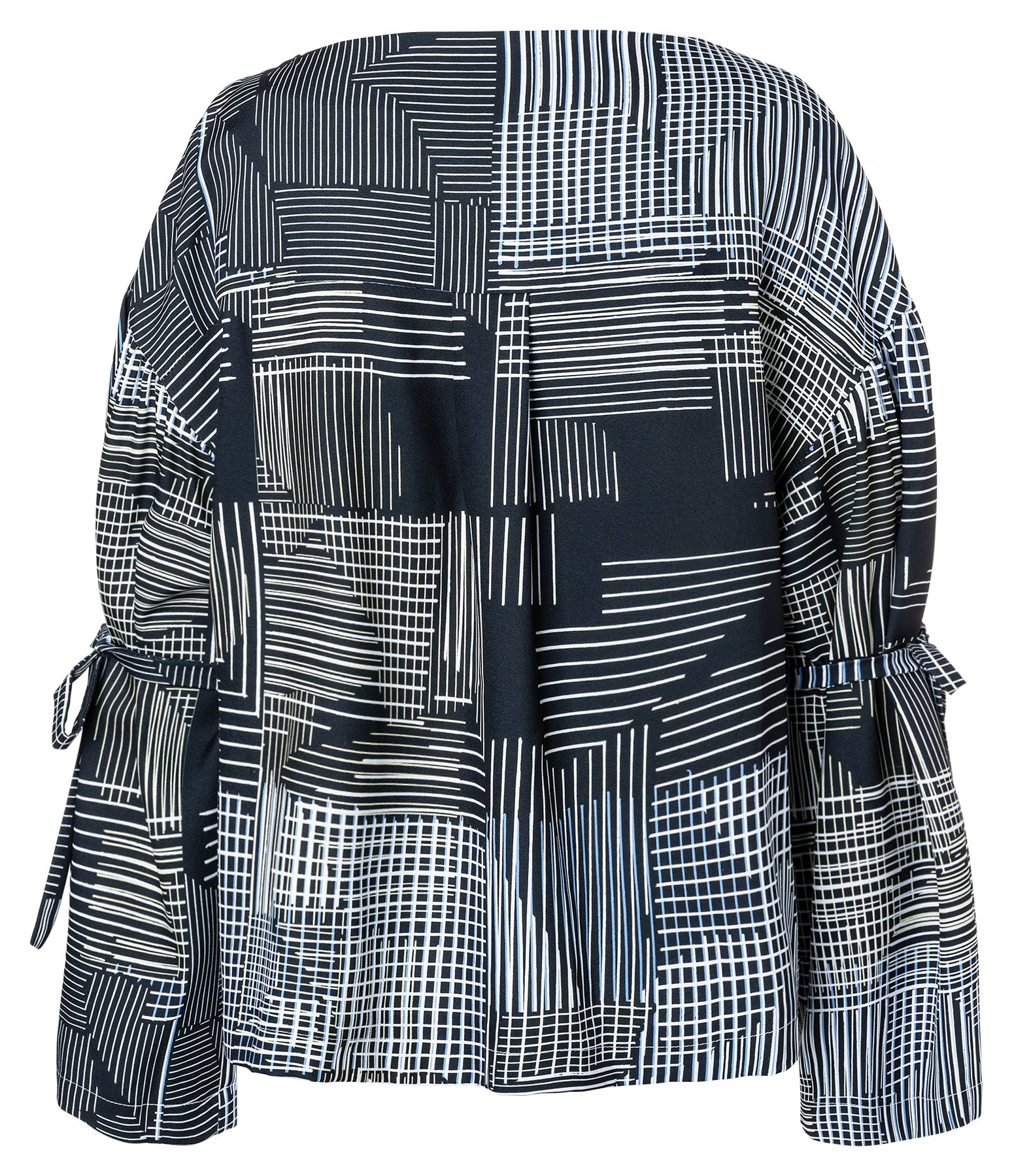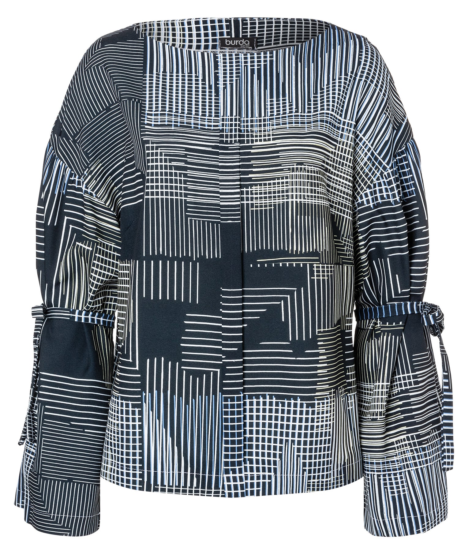 Variante A: Eine gemusterte Bluse mit Gummizug an den Ärmelsäumen und einer raffinierten Falte – lässig, feminin und vielseitig kombinierbar.
