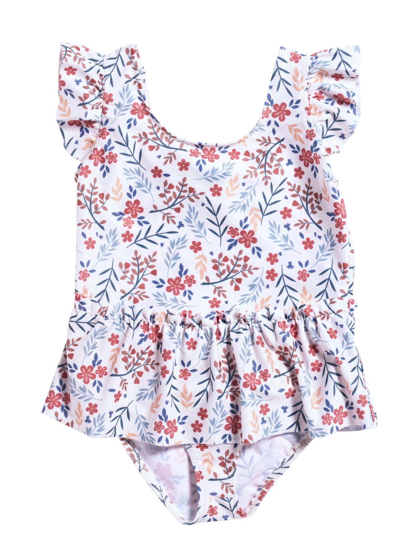 Variante B zeigt sich als romantischer Badeanzug in Blümchen-Optik. Ein Schößchen und Rüschen an den Armausschnitten verleihen dem Modell eine zarte, verspielte Note und lassen es wie ein kleines Badekleid wirken.