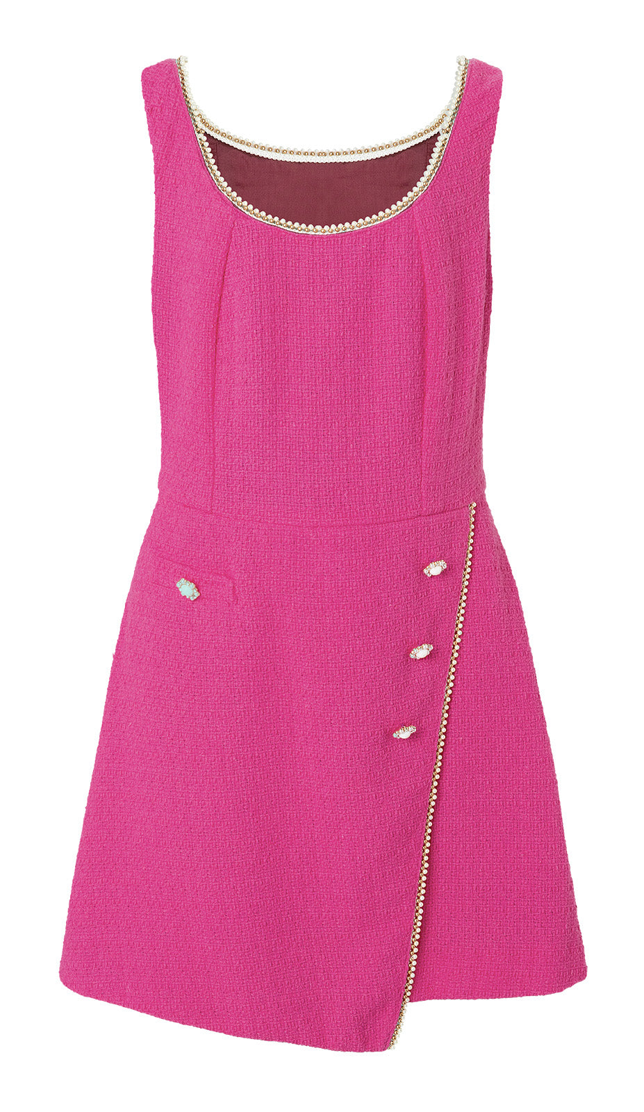 Variante A ist ein kurzes Kleid aus Tweed, das durch eine dezente Borte am Ausschnitt und einen asymmetrischen Schlitz im Rockteil besonders modisch wirkt. Funkelnde Zierknöpfe setzen schöne Akzente und verleihen dem Kleid eine elegante Note.