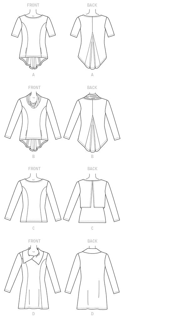 Pullover-Tunika (im Brustbereich eng anliegend) mit Seitennähten vorne und abgesteppten Säumen. A und B: Seitliche Vordertaschen, Rückenpatte und geformter Rückensaum, falsche Seite zeigt. C: Überlagerter Rücken. B und D: Kragenvarianten. Ausschnitt A, C und Überzug C: Enger Saum. Nur für mäßig dehnbare Strickwaren.