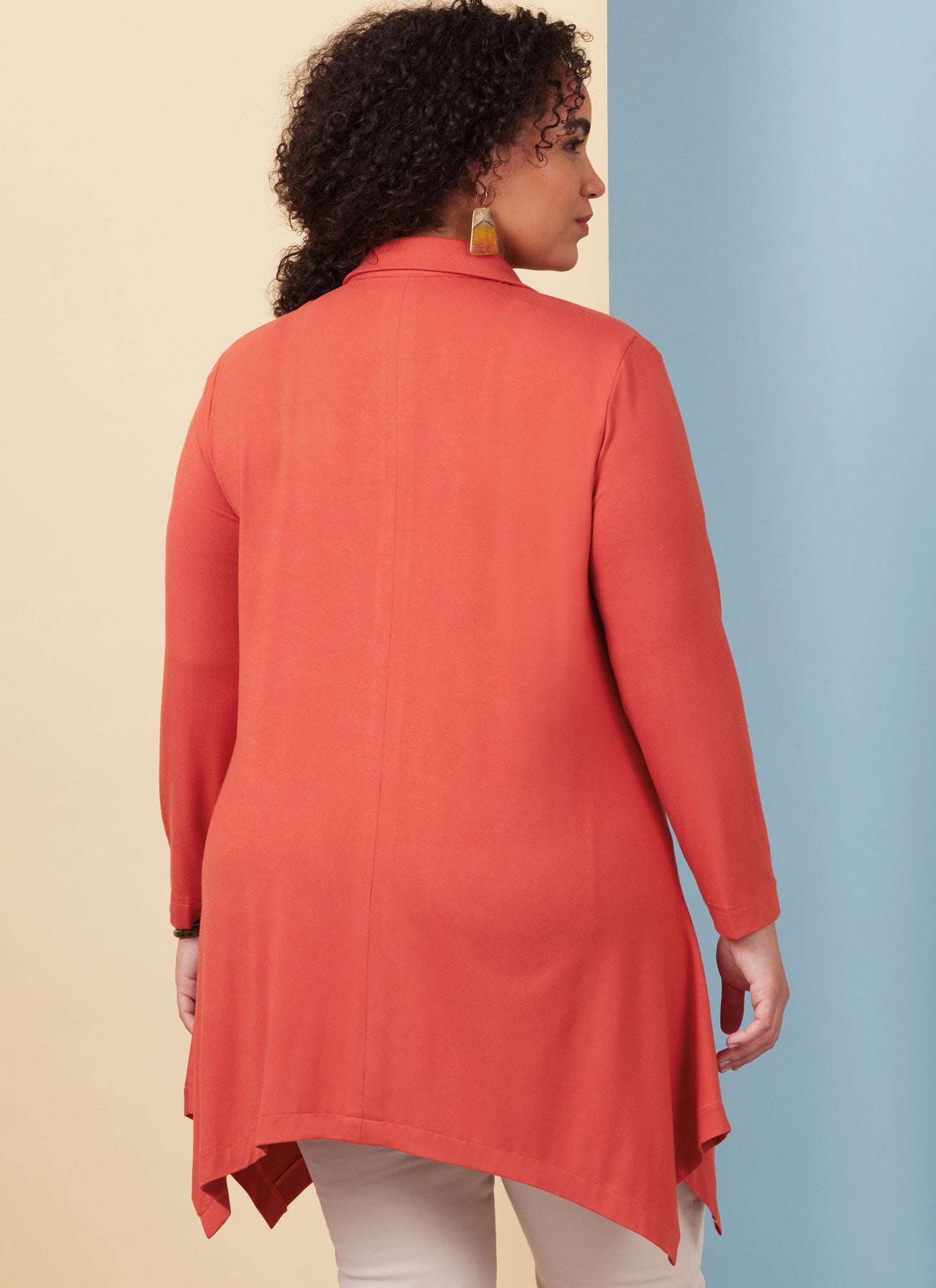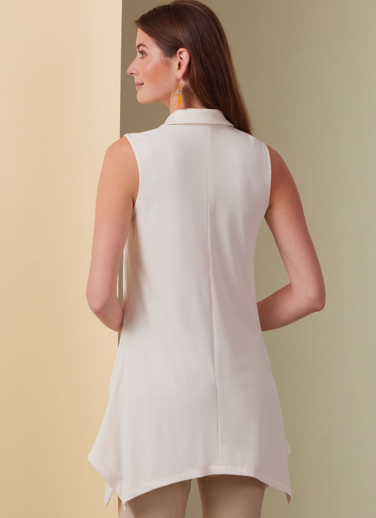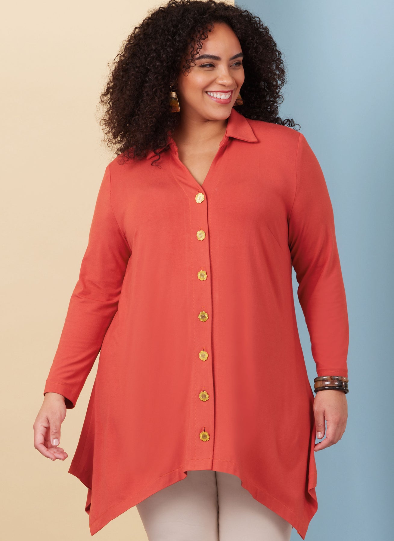 Eng anliegende Strickoberteile haben einen Kragen, ein Kragenband, einen Knopfverschluss vorne, einen geformten Saum und Brustabnäher. Ansicht A hat eingeschnittene Schultern, gekaufte schräge Armlochbelege. Bei Ansicht B sind die Ärmel 7/8 lang und angesetzt.