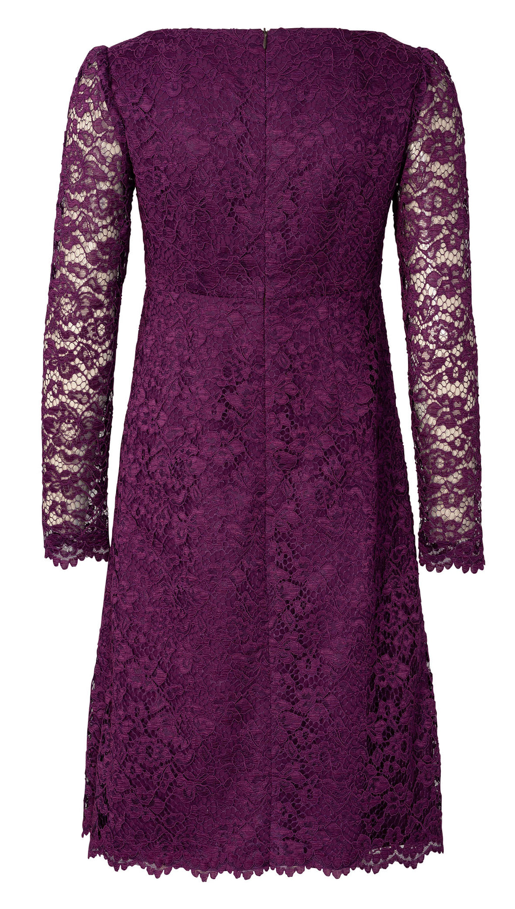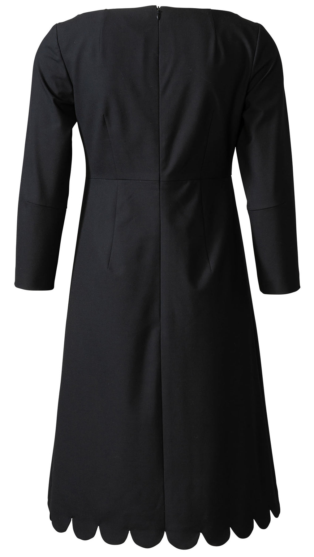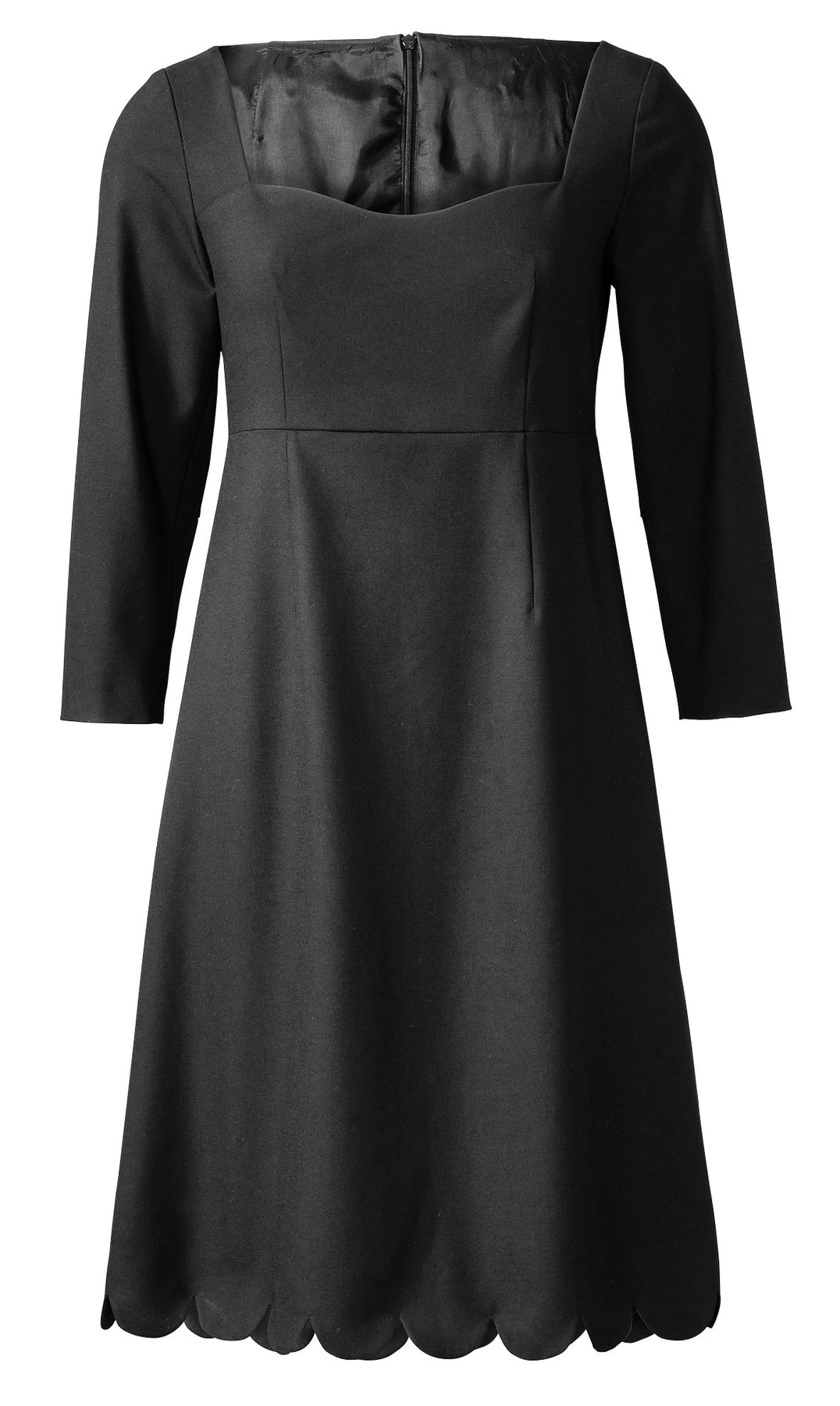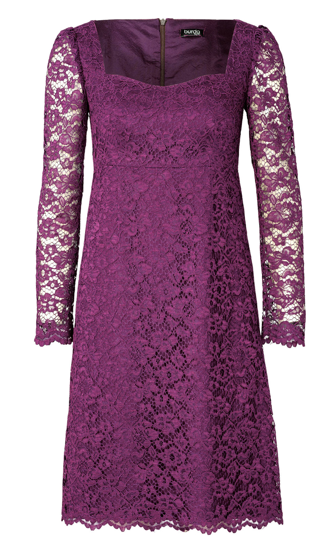 Zwei Cockailkleider nach einem Schnitt, beide mit schön geformtem Ausschnitt in schmaler Silhouette mit leicht ausgestelltem Rock und gebogter Saumkante. Bei Kleid A kommt Spitzenstoff zum Einsatz, der an den Ärmeln, die nicht unterlegt werden, eine schöne Transparenz ergibt.