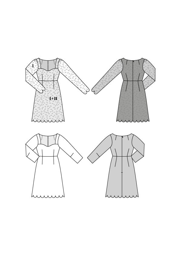 A I: Spitzenstoff mit einseitiger Bogenkante, A II, B: Kleiderstoffe mit etwas Stand AB: 1 nahtverdeckter Reißverschluss, 60 cm lang. B: Aufbügelbare Einlage