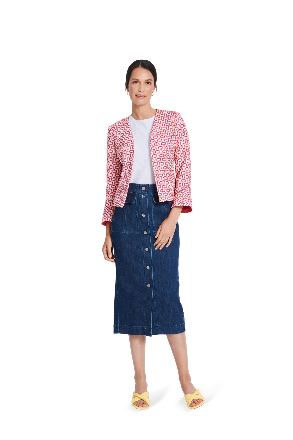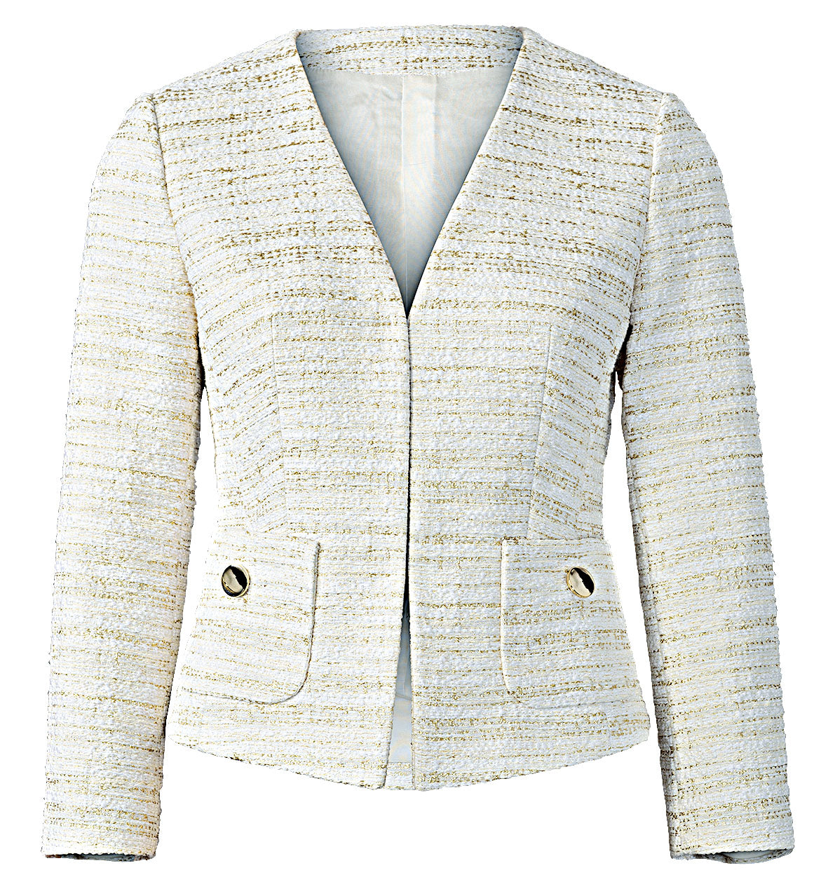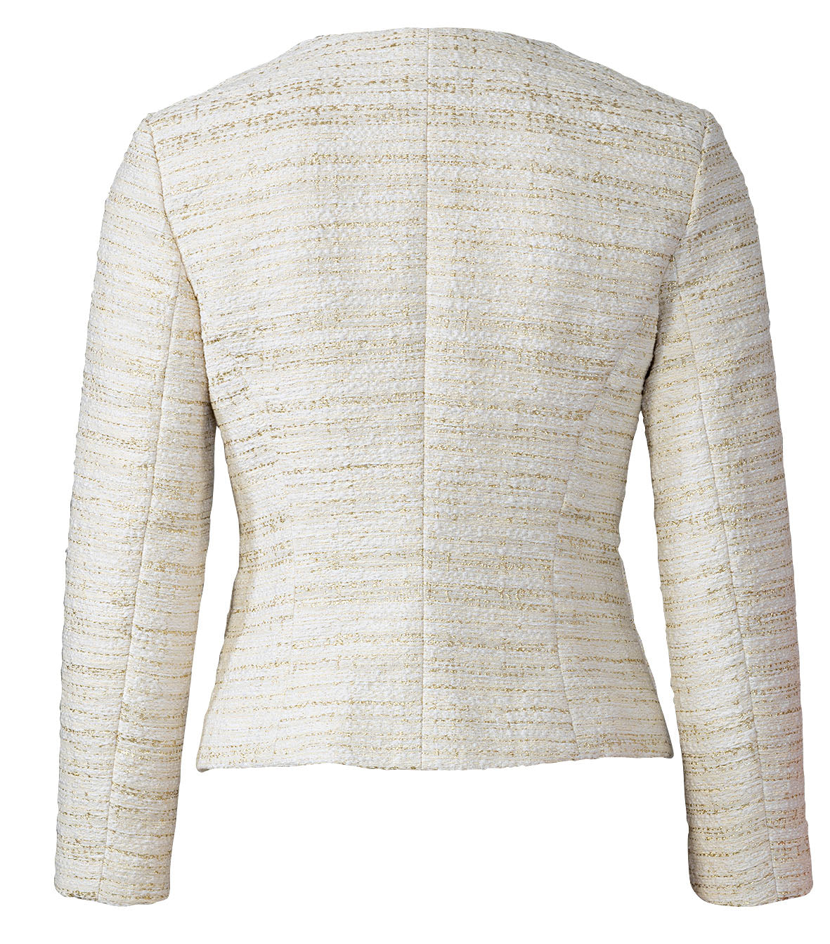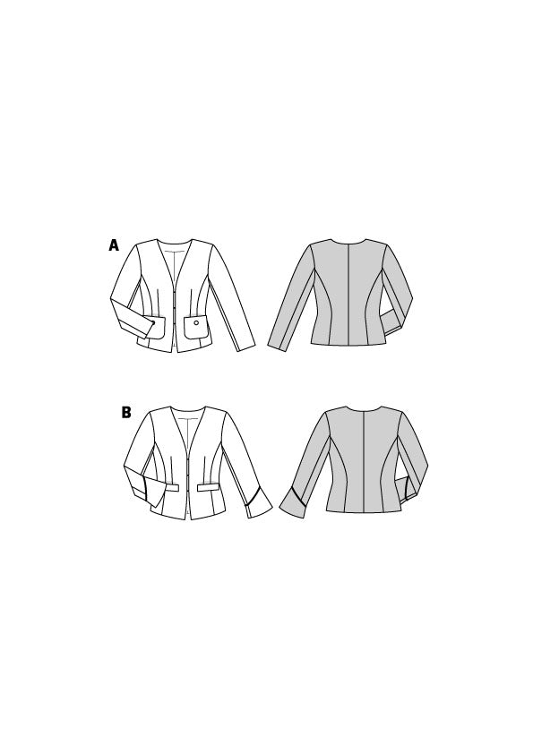 Elegante Jäckchen, durch Abnäher und Teilungsnähte sehr körperbetont. A hat aufgesetzte Taschen, B mit Pattentaschen und einen kleinen Volant am Ärmelsaum. Beide Jacken sind gefüttert und werden Kante an Kante mit Haken und Ösen geschlossen.