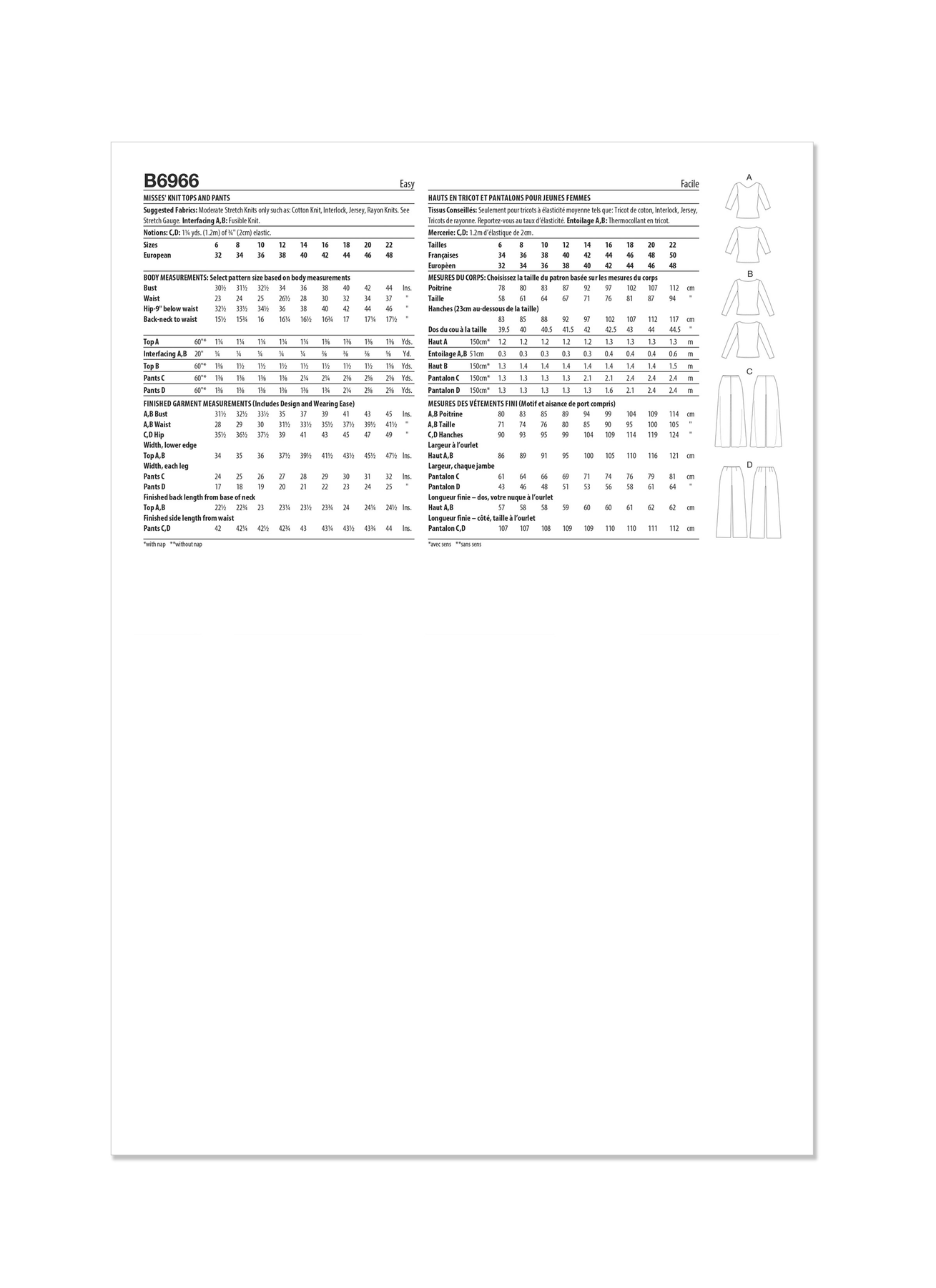 Stoffempfehlung:Nur mäßig dehnbare Gestricke wie z. B.: Baumwollstrick, Interlock, Jersey, Rayon-Strickwaren. Siehe Stretch Gauge. Einlage A,B: Schmelzbares Gestrick.