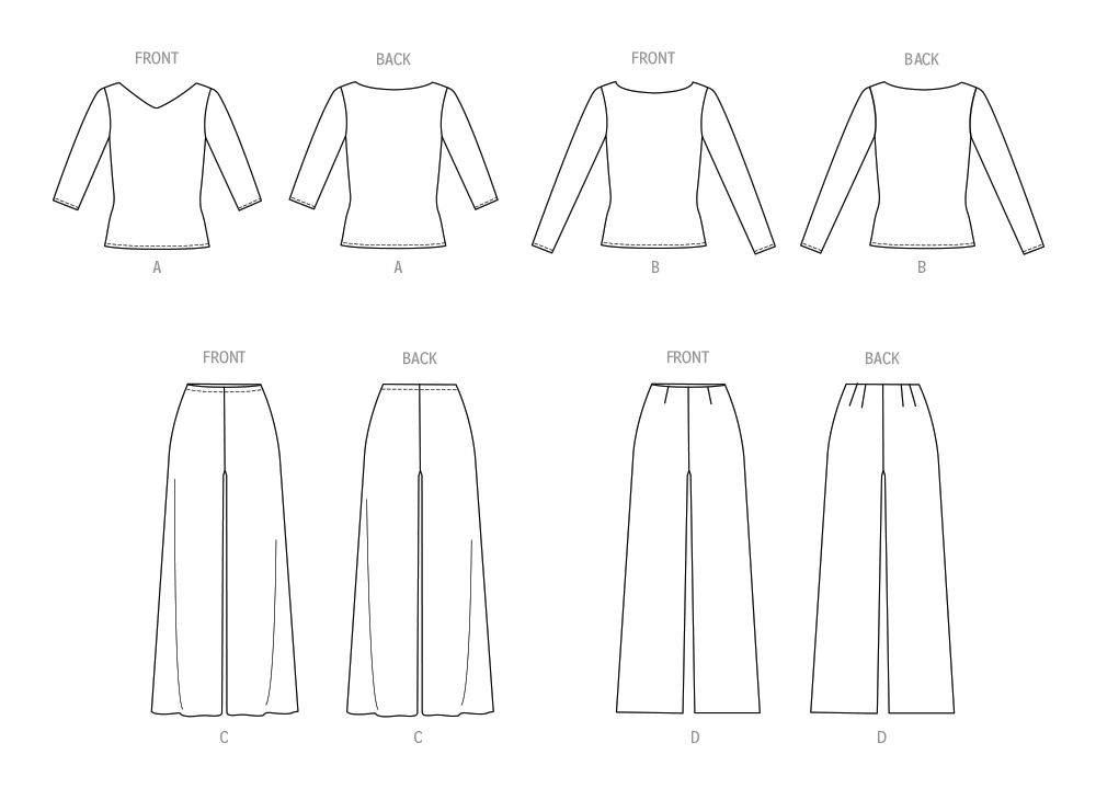 Eng anliegende Pullover-Oberteile haben einen variablen Halsausschnitt, ellbogenlange oder lange Ärmel und schmale Säume. Taillierte Hosen mit geraden oder leicht ausgestellten Beinen haben einen elastischen Bund und keine Seitennähte.