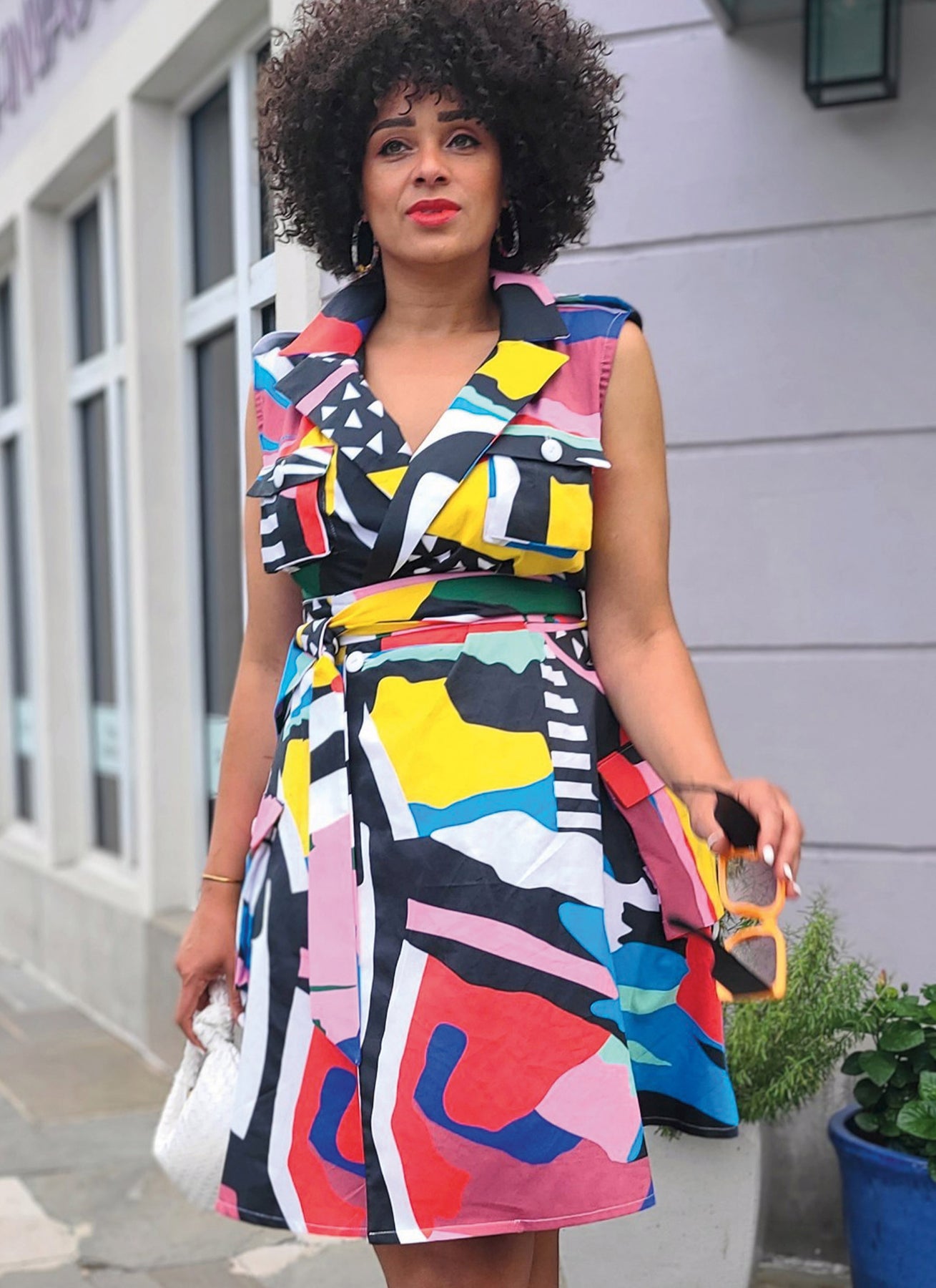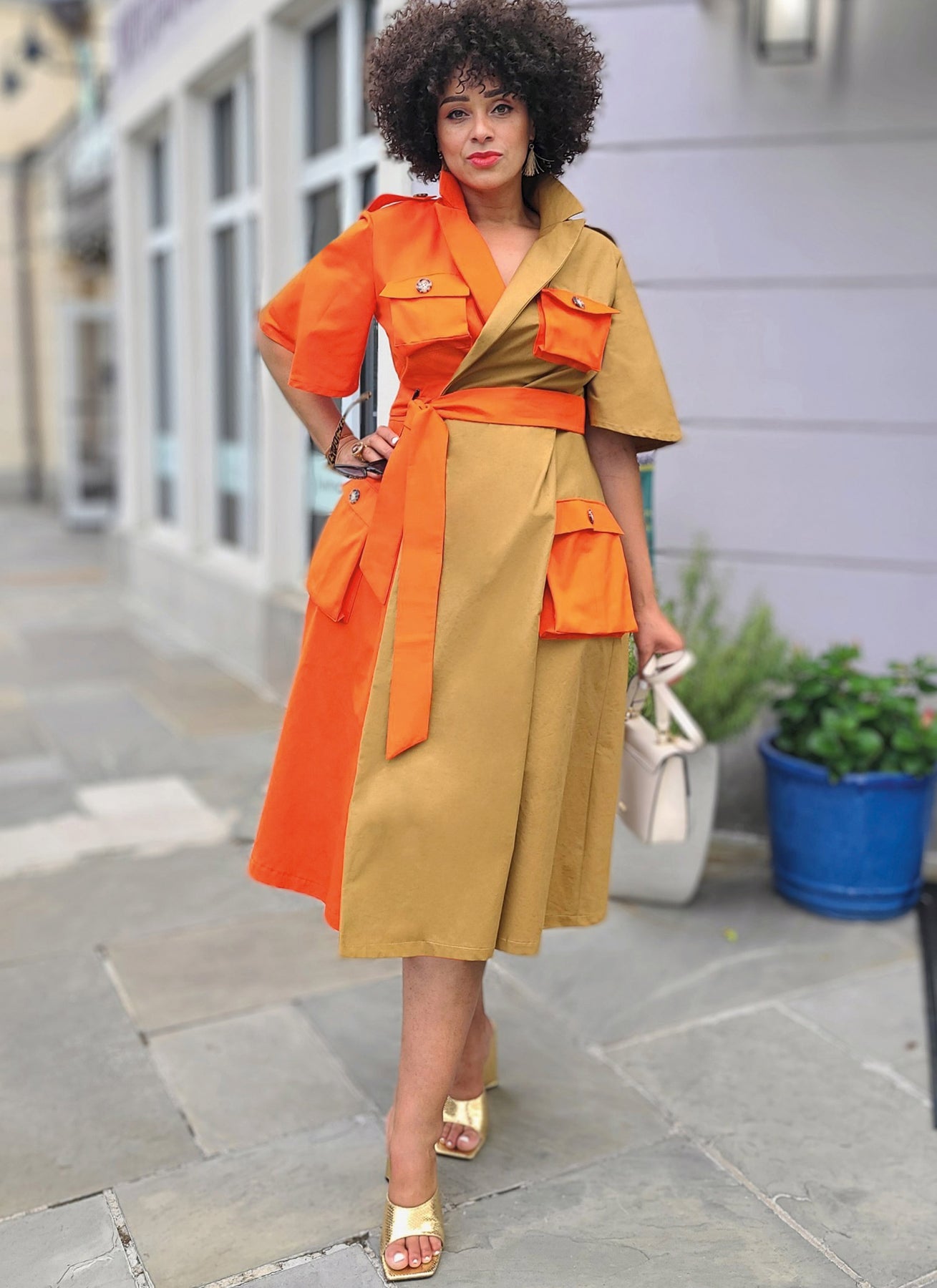 Farbblock-Wickelkleid in zwei Längen mit Hemddetails und Gürtel hat einen breiten gekerbten Kragen, Cargotaschen an den Seiten und auf der Brust, Bänder an der Innenseite und Schulterklappen mit Knopfverschluss. Das Kleid kann mit kurzen Ärmeln oder ärmellos getragen werden.