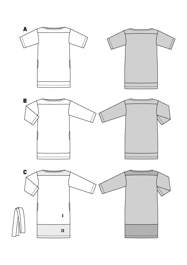 Diese gerade geschnittenen Kleider mit U-Bootausschnitt und Nahttaschen sind ideale Einsteigerprojekte und laden dazu ein kreativ zu werden. Aus einem Stoff genäht fallen die Teilungsnähte kaum auf. Werden verschiedenfarbige Stoffe kombiniert, wird ein Kleid im angesagten Colorblocking-Stil daraus. Kleid C zusätzlich mit Bindegürtel.