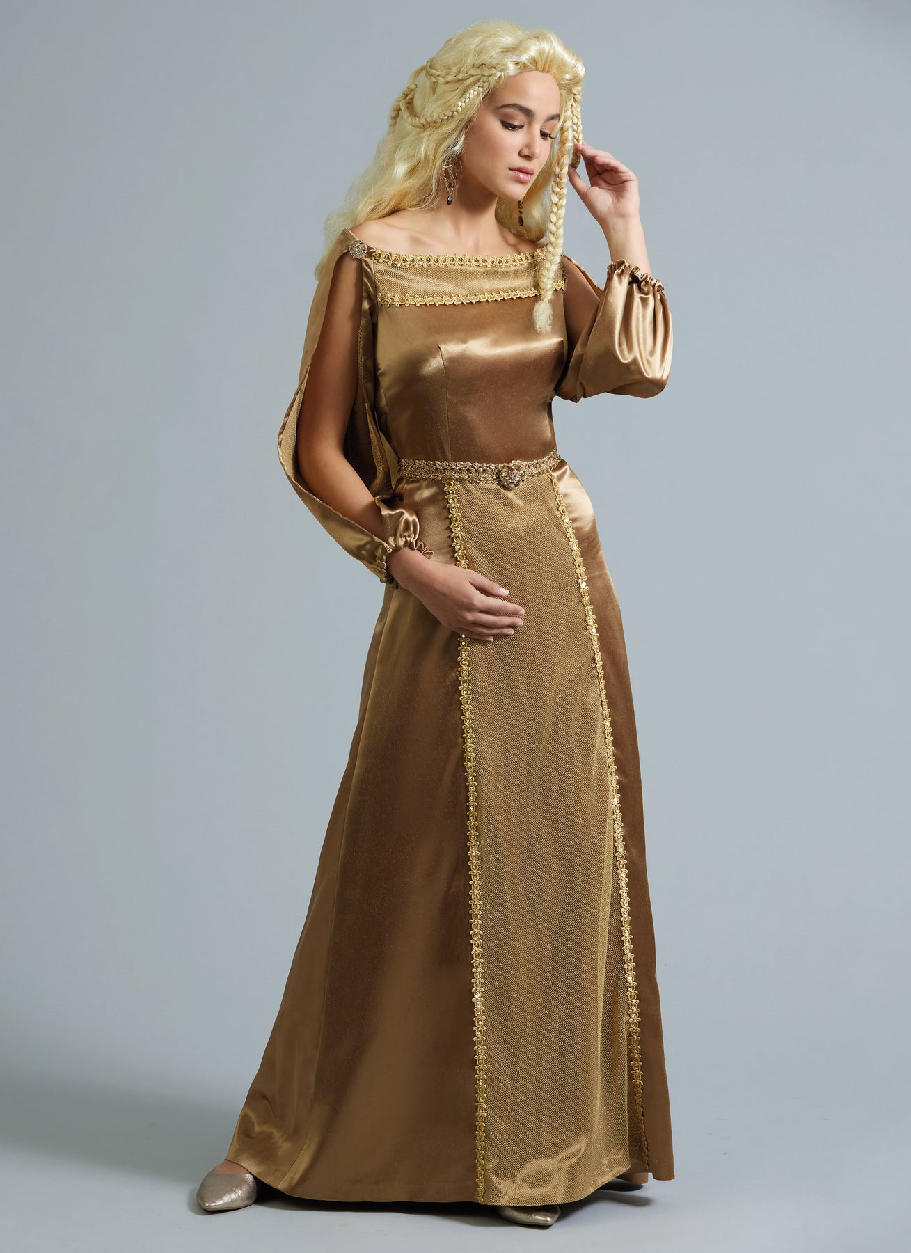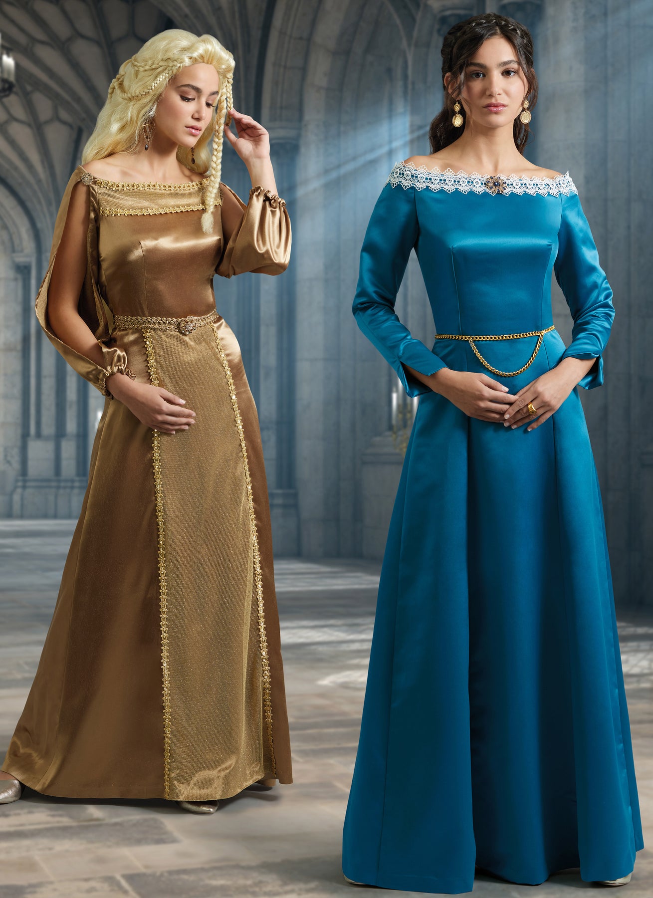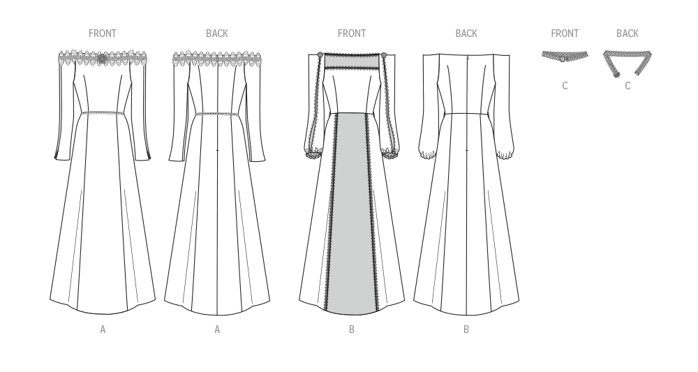 Lange Kleider haben ein tailliertes Oberteil mit Abnähern vorne und hinten und einen ausgestellten Rock. Bei beiden Kleidern sind die Ärmel schulterfrei. Kleid B hat einen separaten Gürtel.