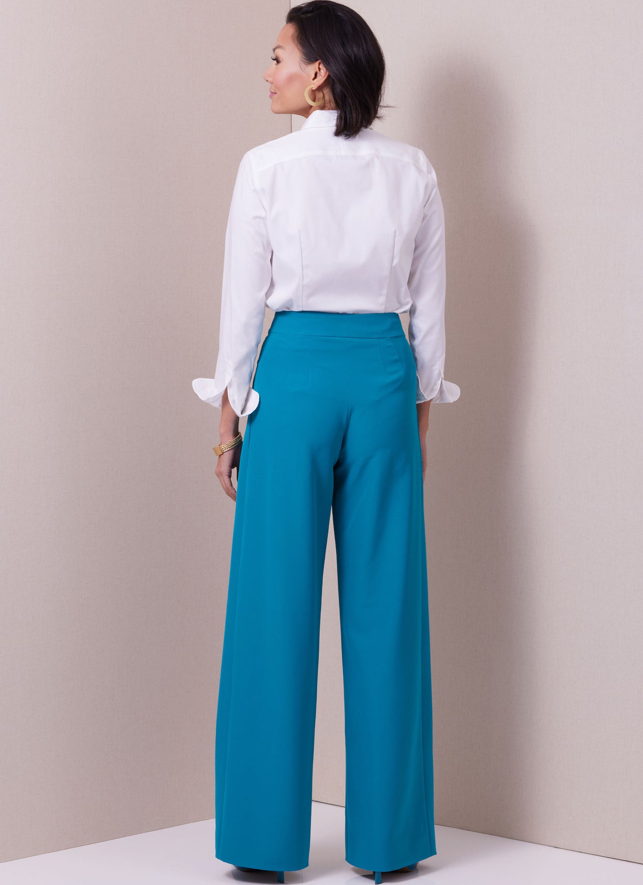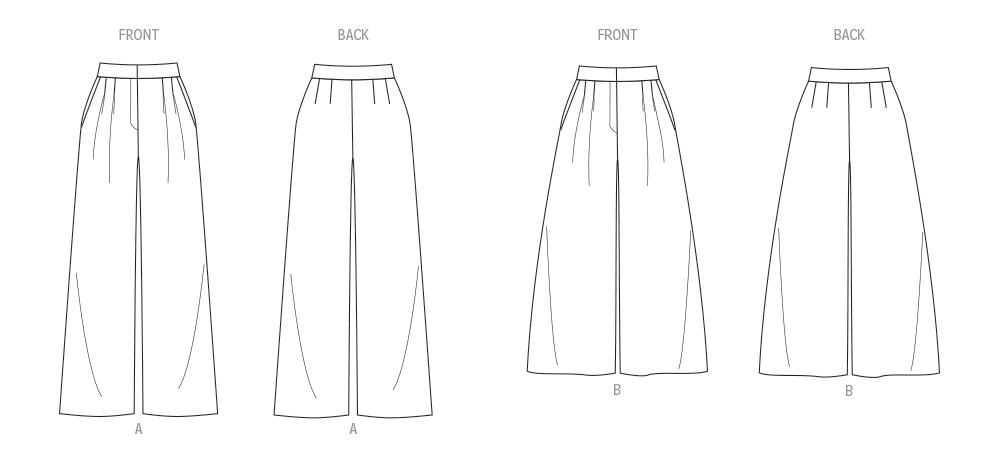 Die Hose mit weitem Bein und die verkürzte Hose haben einen konturierten Bund, einen Reißverschluss mit Schlitz vorne, Eingrifftaschen, Falten vorne und Abnäher hinten.