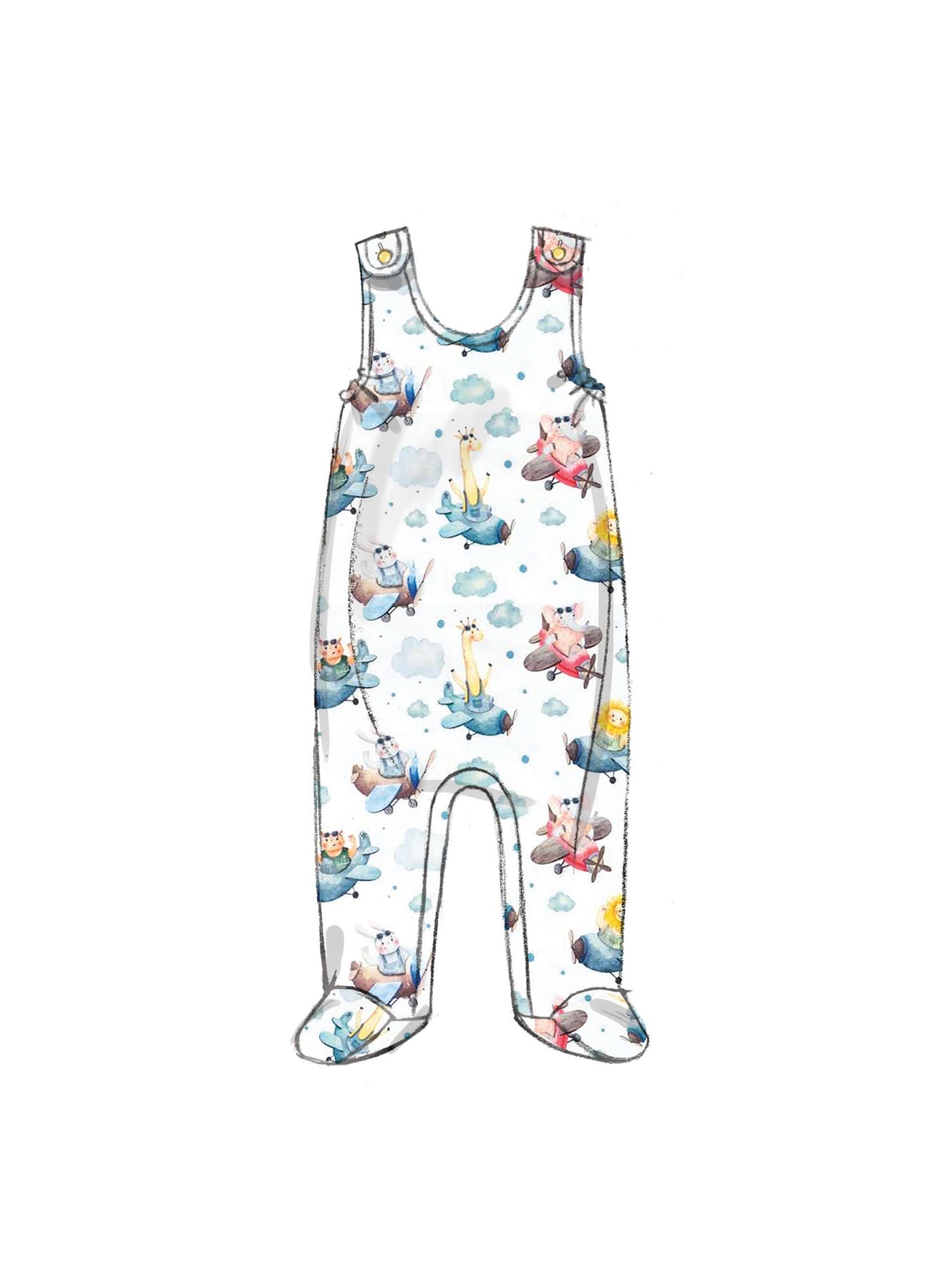 Locker sitzende Jacke, Pullover, Kleid und Strampler haben schmale Säume. Die Jacke hat lange Ärmel und einen Knopfverschluss. Strampler haben einen Druckknopf im Schritt. Bild G Strampler hat einen Knopfverschluss. Die Windelhülle hat einen Klettbandverschluss.