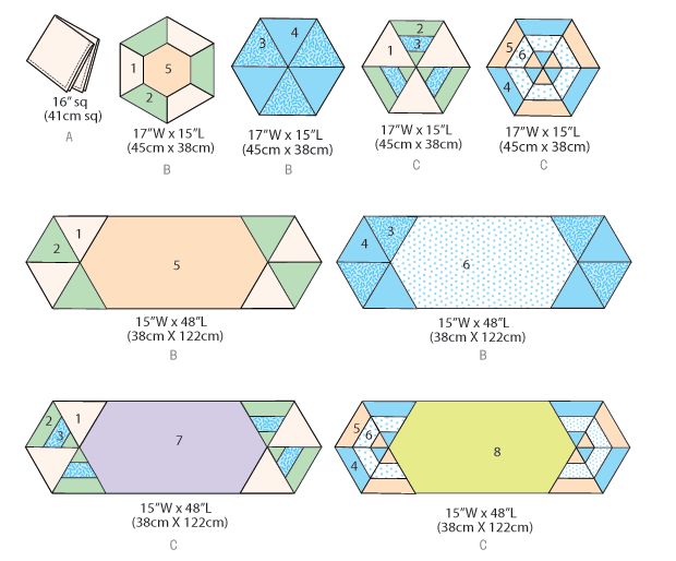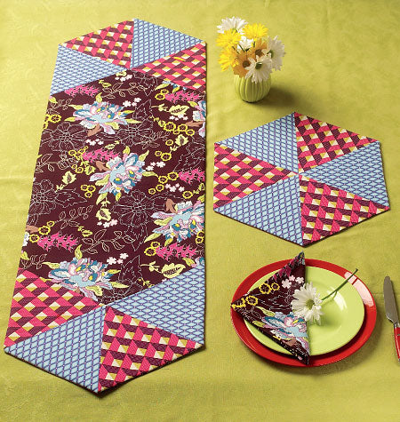 Set a beautiful table with these colorful, coordinating Napkins, Placemats and Runners. Placemats and Runners B, C are lined with fleece for cushioning, have pieced fronts and backs and are fully reversible.