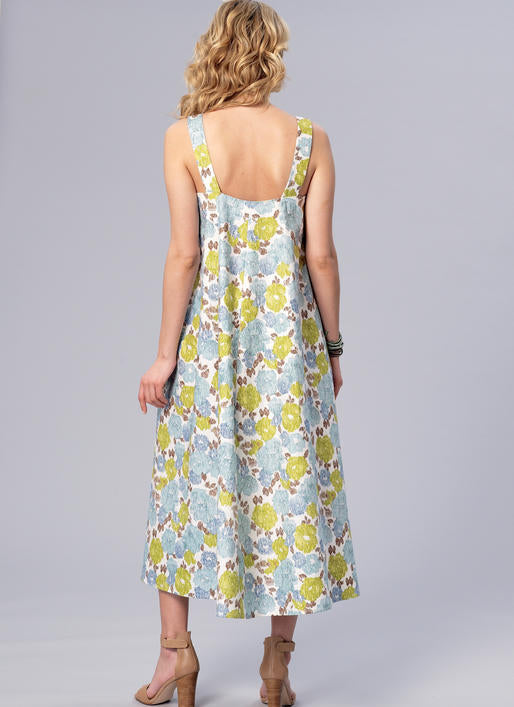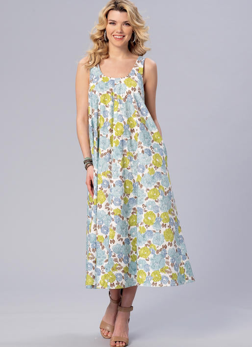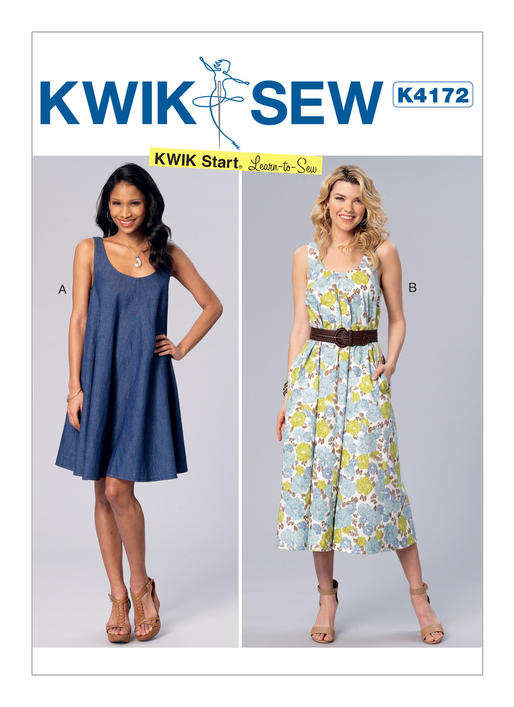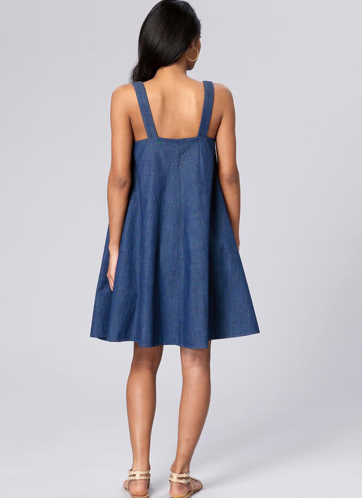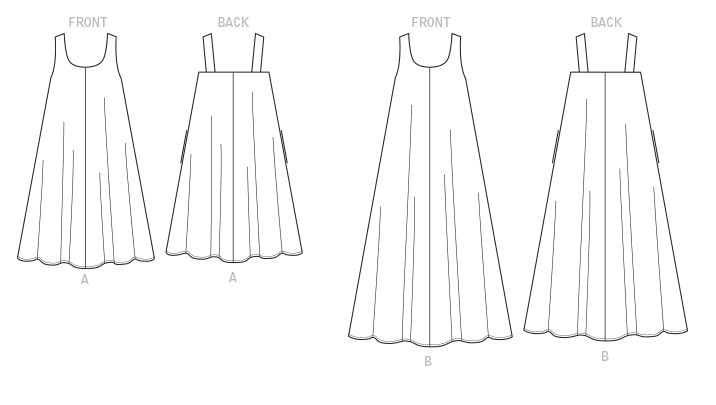 Pullover dresses are semi-fitted through bust, have front scoop neckline, facings, back straps, side seam pockets, and stitched hems. A: Shorter length. B: Longer length.