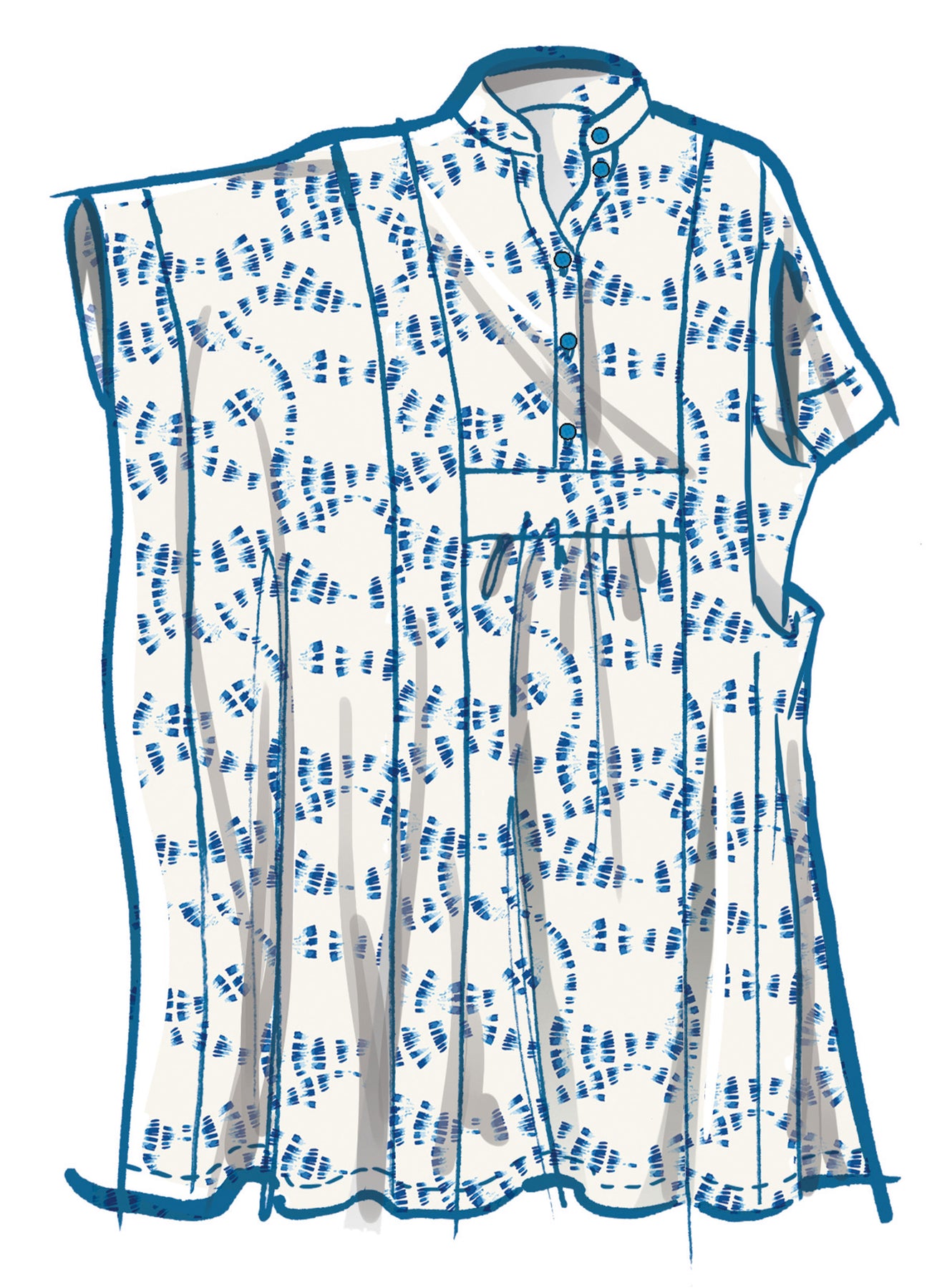 Kaftane mit Knopfleiste haben Knopfleisten, Raffung in der Taille, Kragenbänder, Kragenständer und Kragen. Ansicht C hat Kontrast an Bändern, Kragen, Kragenständer und Knopfleiste.