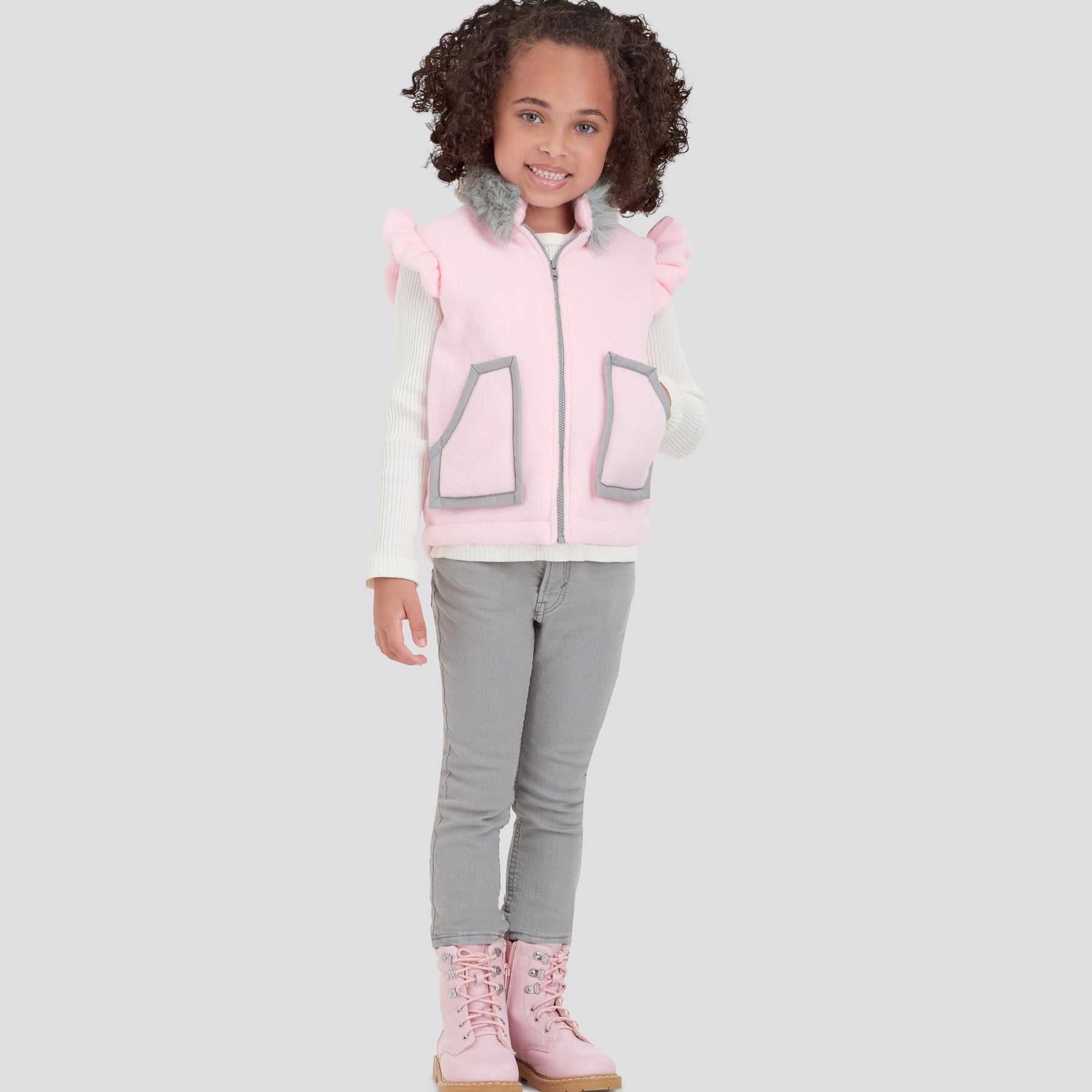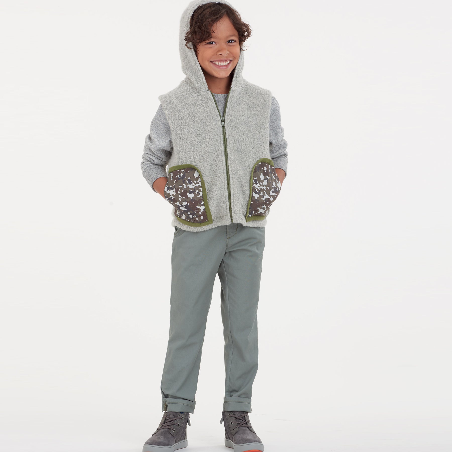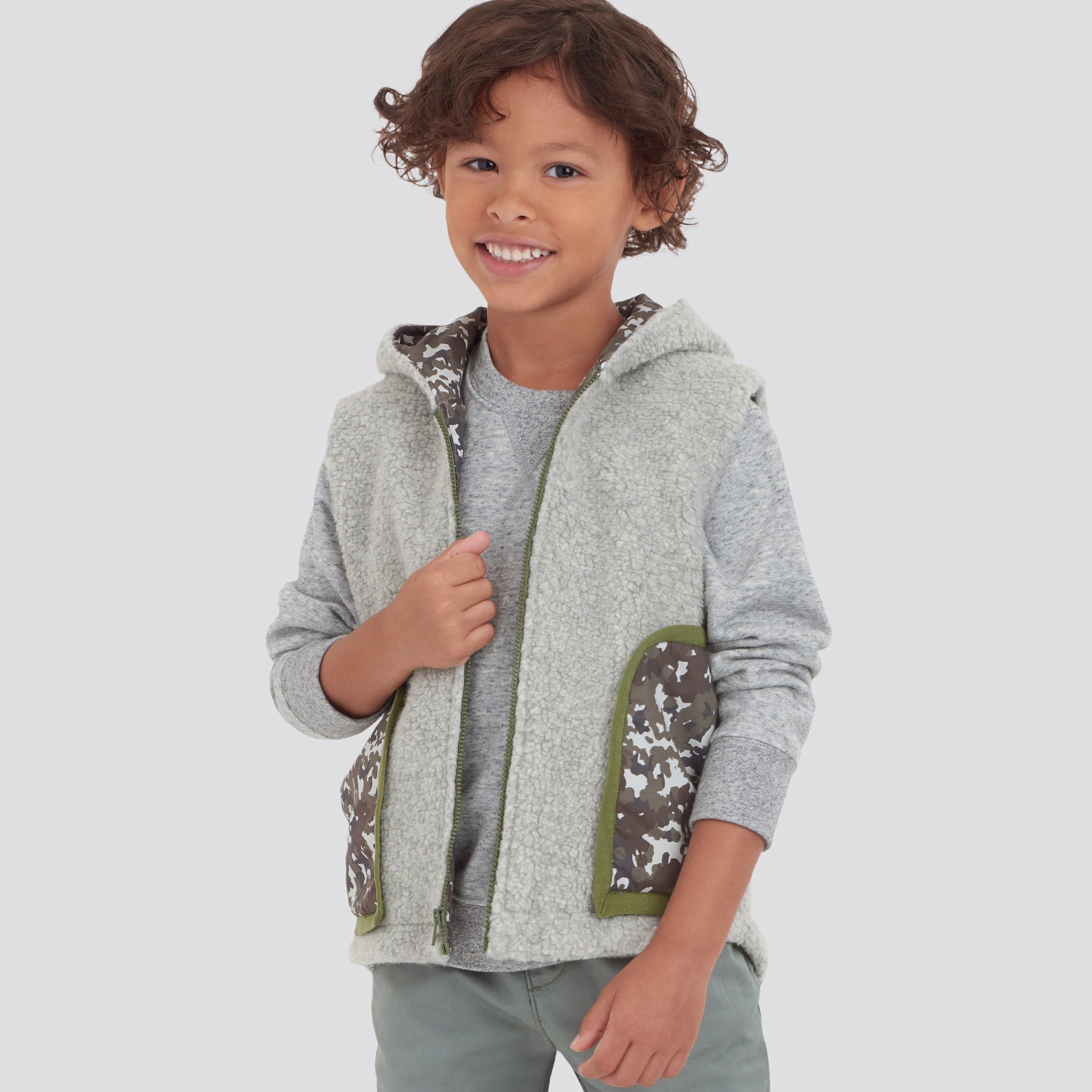 Kinderweste mit Reißverschluss und Kragen- und Kapuzenvarianten.