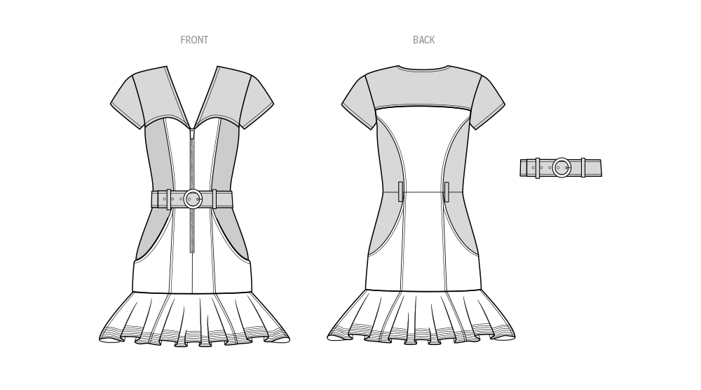 Das Kleid im Retro-Stil hat einen Reißverschluss in der Mitte der Vorderseite, eine Passe mit künstlichem Bustier, einen V-Ausschnitt, Kappenärmel, Prinzessinnenleisten und Prinzessinnennähte. Das Kleid hat einen voluminösen Saum und einen Taillengürtel.