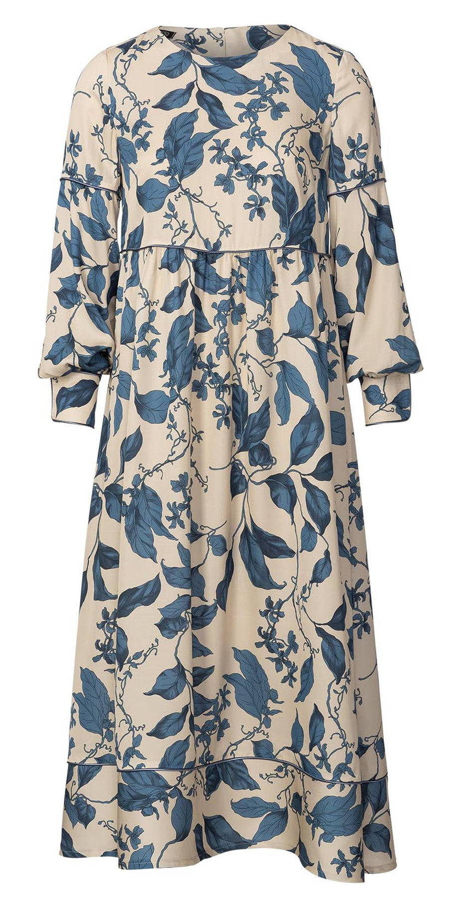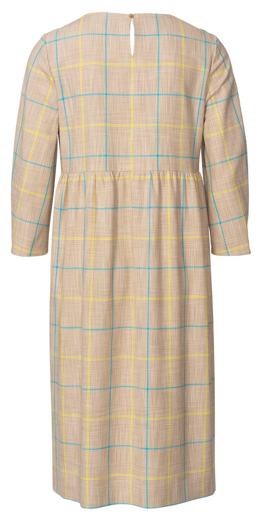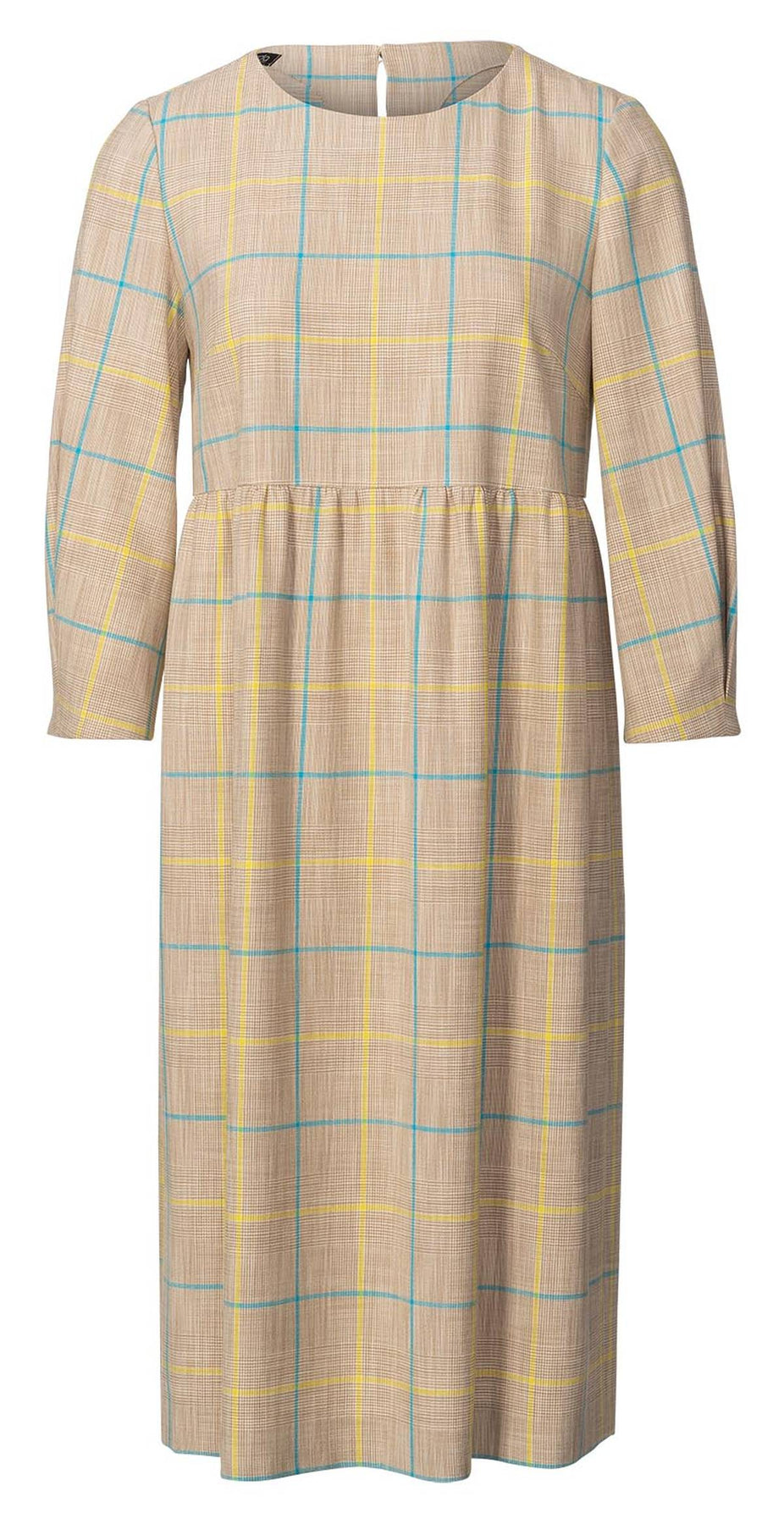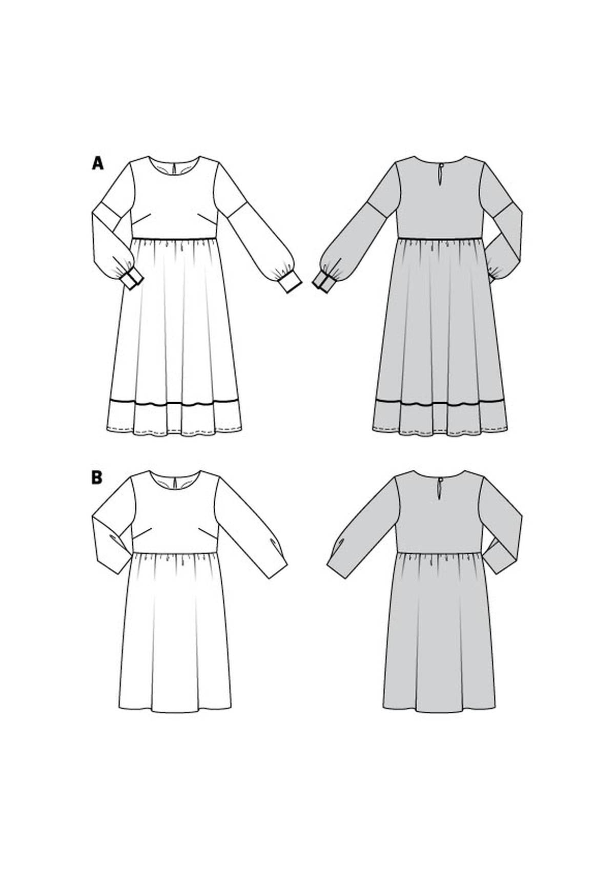Anziehen und Wohlfühlen ist angesagt bei diesem Kleid mit hoch angesetztem Rockteil und rundem Ausschnitt mit Schlitz im Rückenteil. A wadenlang mit weiten Ärmeln, die mit Manschetten gebändigt werden. B ist kniekurz und hat einen schmaleren Ärmel mit Falten als Abschluss.