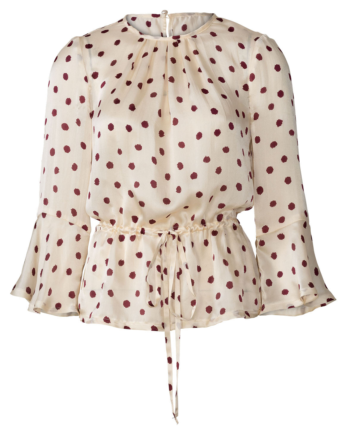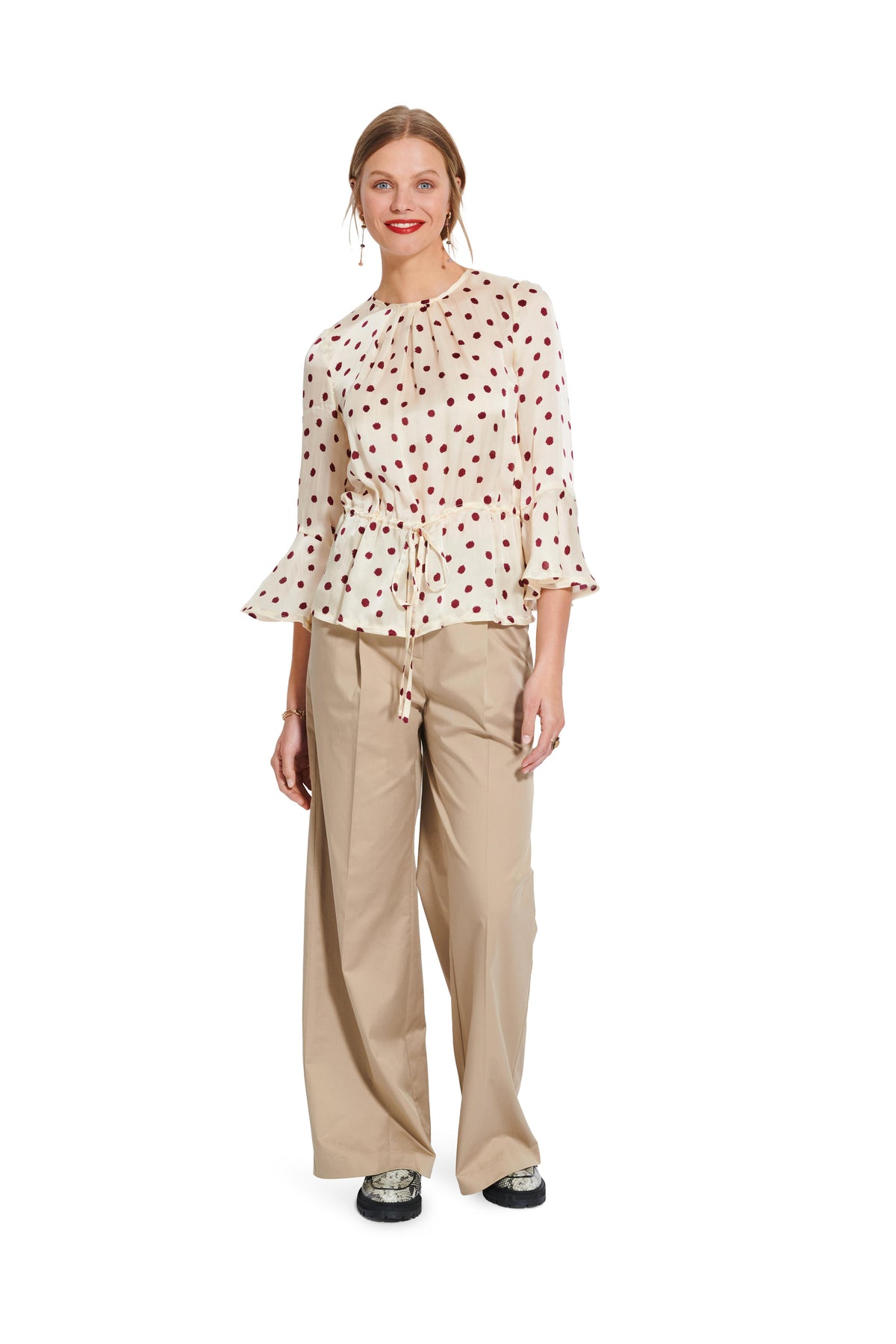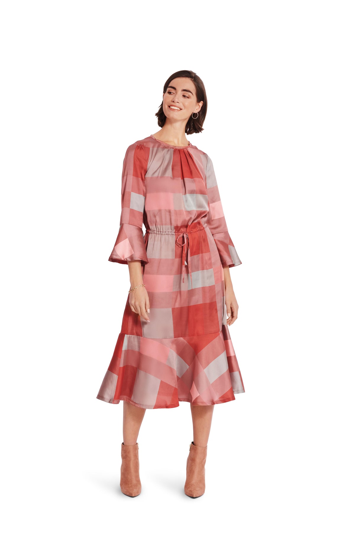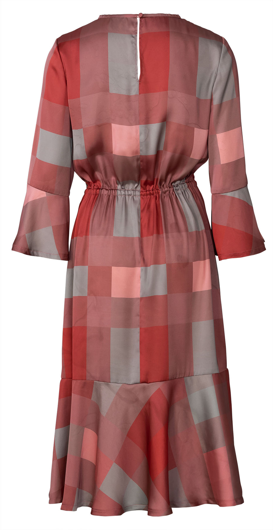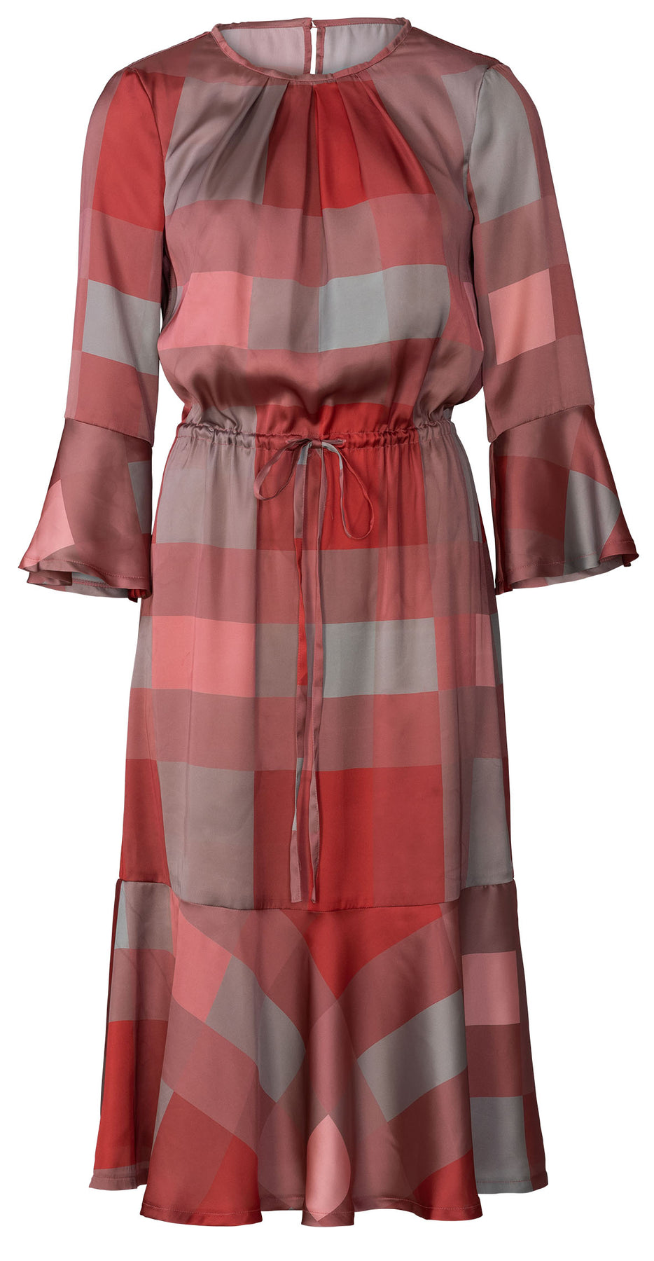 Das Kleid mit hübschen Volants an den Ärmeln und am Rock wird mit einem Banddurchzug in der Taille reguliert. Die kleinen Fältchen am eingefassten Halsausschnitt geben ebenfalls etwas Weite und unterstreichen die beschwingte Gesamterscheinung. Die hüftlange Bluse in gleicher Schnittführung gefällt mit Schößchendetail.