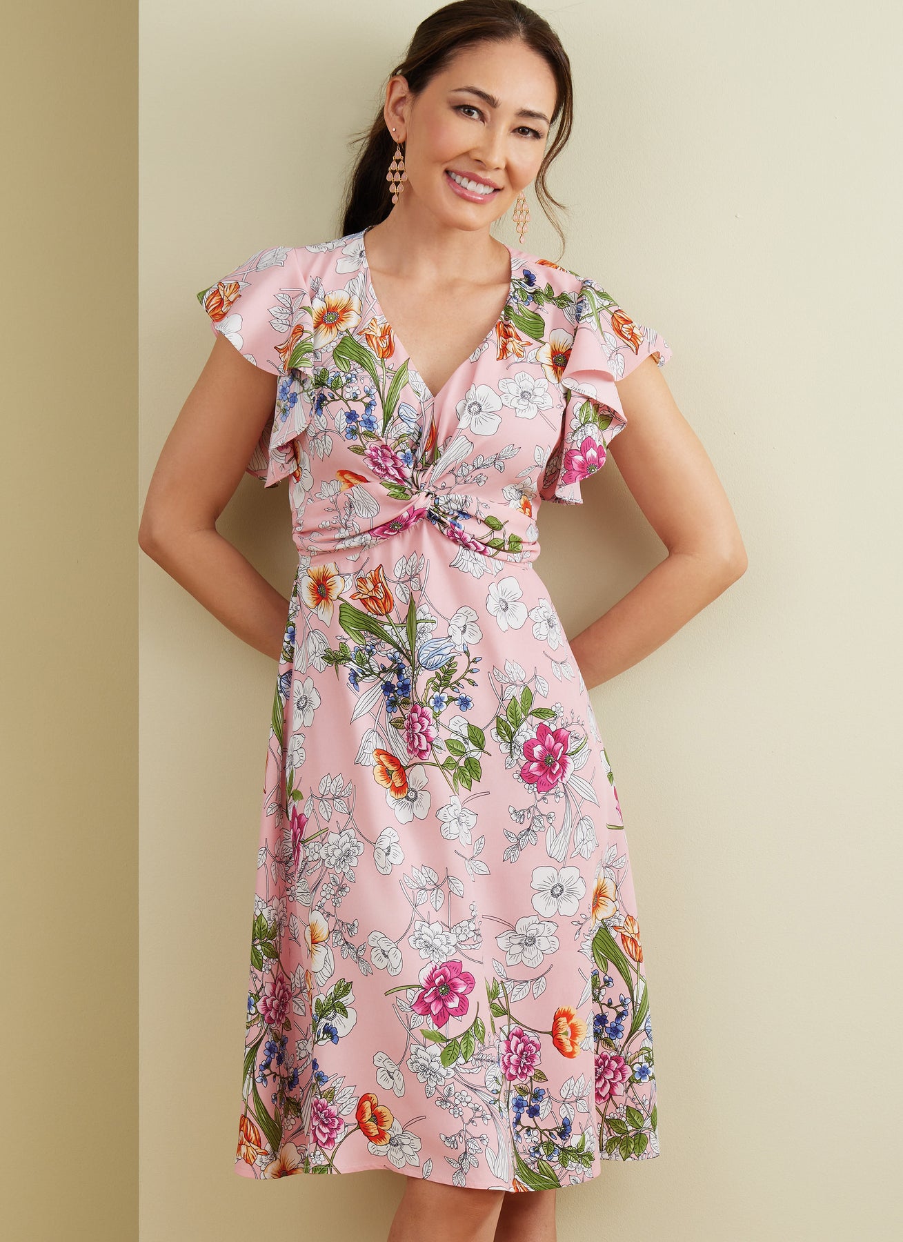 Das Kleid mit V-Ausschnitt und der Jumpsuit haben ein Mieder mit Drehung vorne und einen unsichtbaren Reißverschluss hinten. Die Ansichten A und C haben gerüschte Ärmel. Ansicht B ist ärmellos. Das Kleid gibt es in zwei Längen.