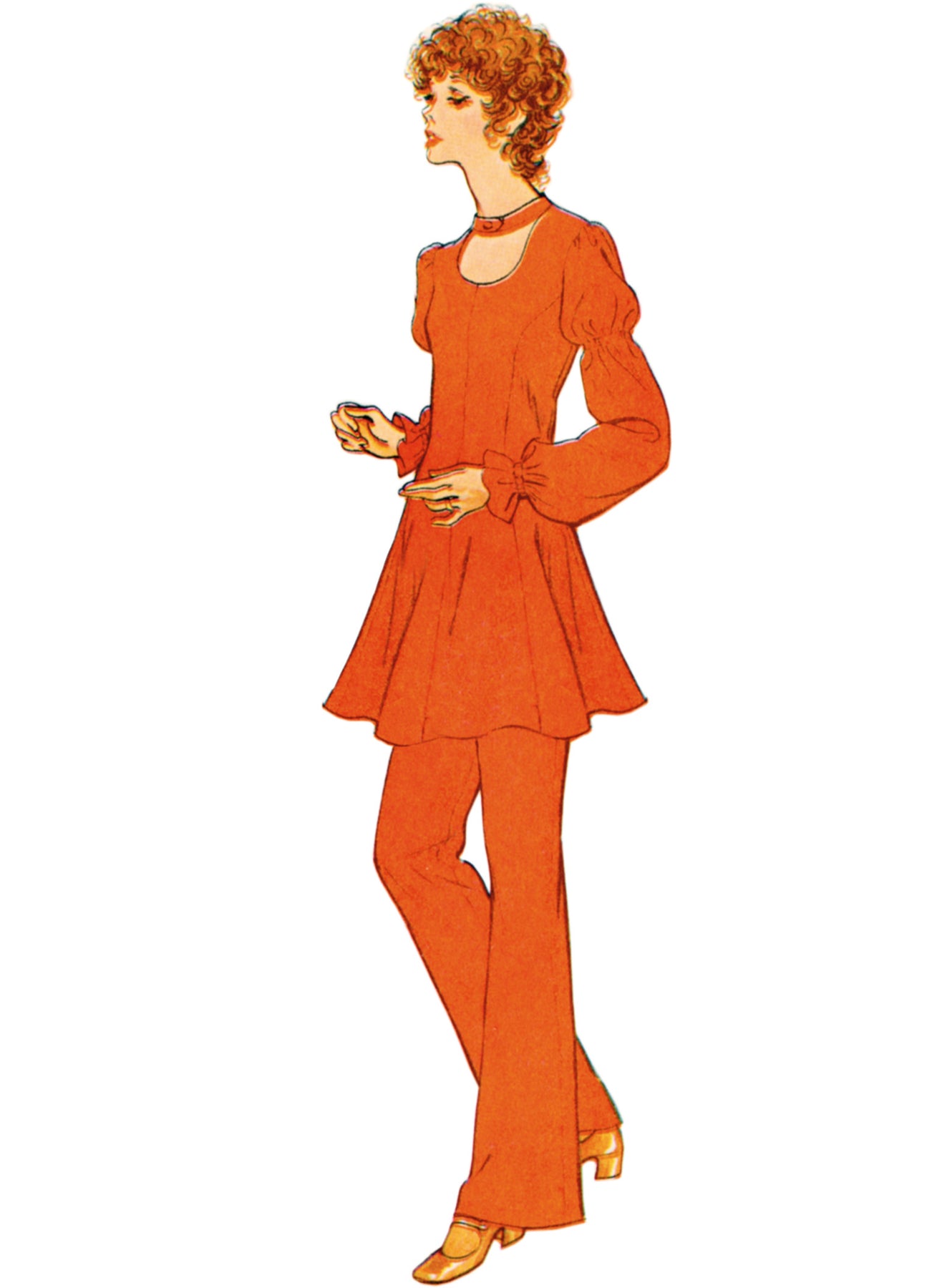 Vintage McCall's 1970's Kleid, Tunika und Hosen Nähmuster. Kleid oder Tunika mit Reißverschluss auf der Rückseite, mit Puffärmeln und zweiteiligem, knopfbesetztem Kragen. Kurze Ärmel haben einen Gummizug in der Hülle. Lange Ärmel haben einen Gummizug in der oberen und unteren Hülle. Die Hose hat einen Gummizug in der Hülle. Authentische Vintage-Reproduktion mit zusätzlichen Größen und Schnittmustern.