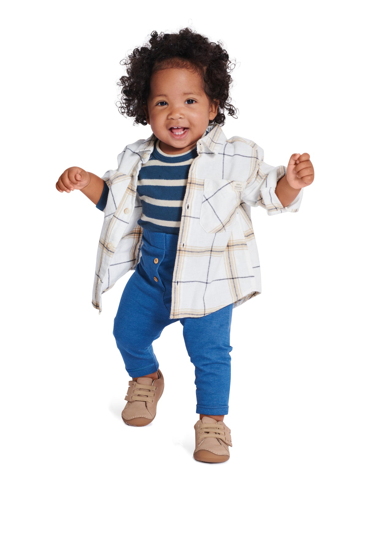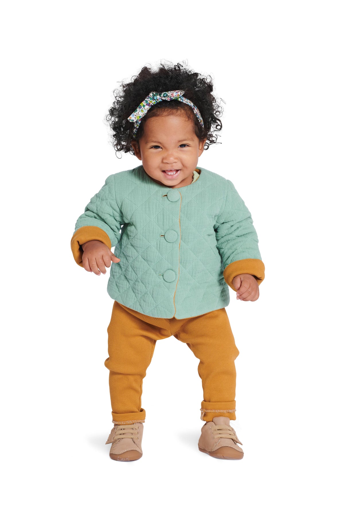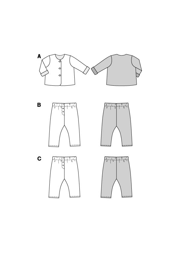 Ein komplettes Outfit für die Kleinsten bestehend aus der kragenlosen Jacke zum Knöpfen und den bequemen Schlupfhosen mit Gummibund in zweierlei Länge. Beim Hochkrempeln der Ärmel blitzt dass Futter der komplett gefütterten Jacke hervor.