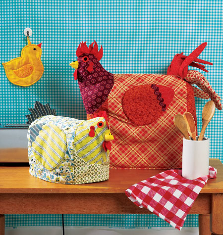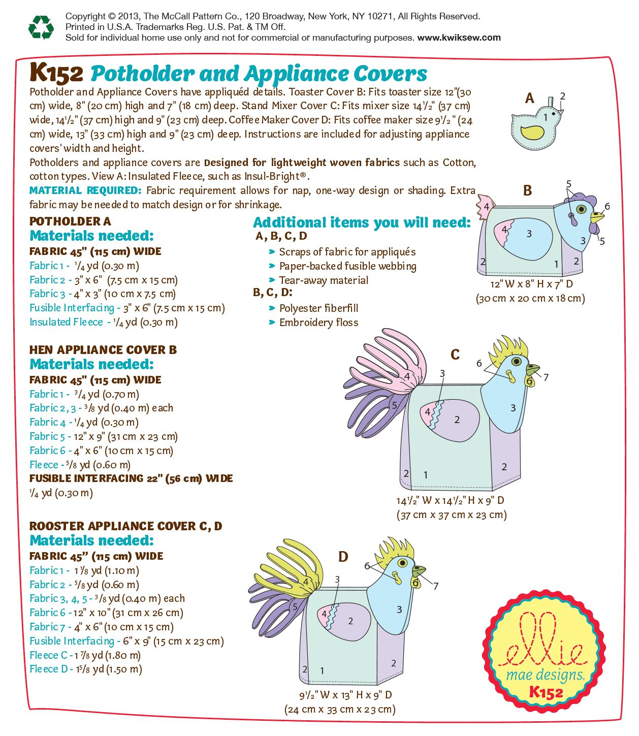 Potholder and Appliance Covers have appliquéd details. Toaster Cover B: Fits toaster size 12" (30 cm) wide, 8" (20 cm) high and 7" (18 cm) deep. Stand Mixer Cover C: Fits mixer size 14½" (37 cm) wide, 14½" (37 cm) high and 9" (23 cm) deep. Coffee Maker Cover D: fits coffee maker size 9½" (24 cm) wide, 13" (33 cm) high and 9" (23 cm) deep. Instructions are included for adjusting appliance covers' width and height.