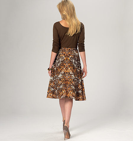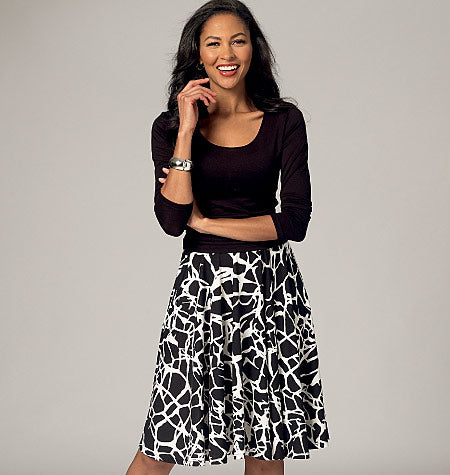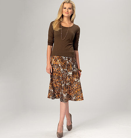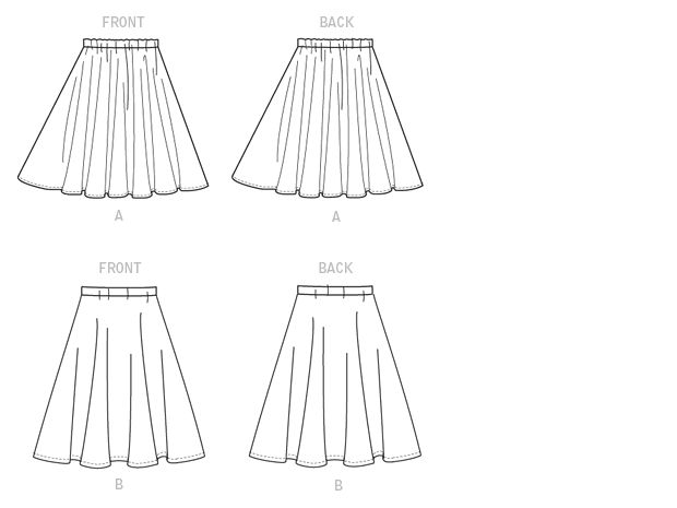 Pull on skirts have separate waist casing with elastic and narrow hems in two lengths. View A: Flared. View B: A-line. Skirts are very easy to make and have special easy-to-follow instructions.