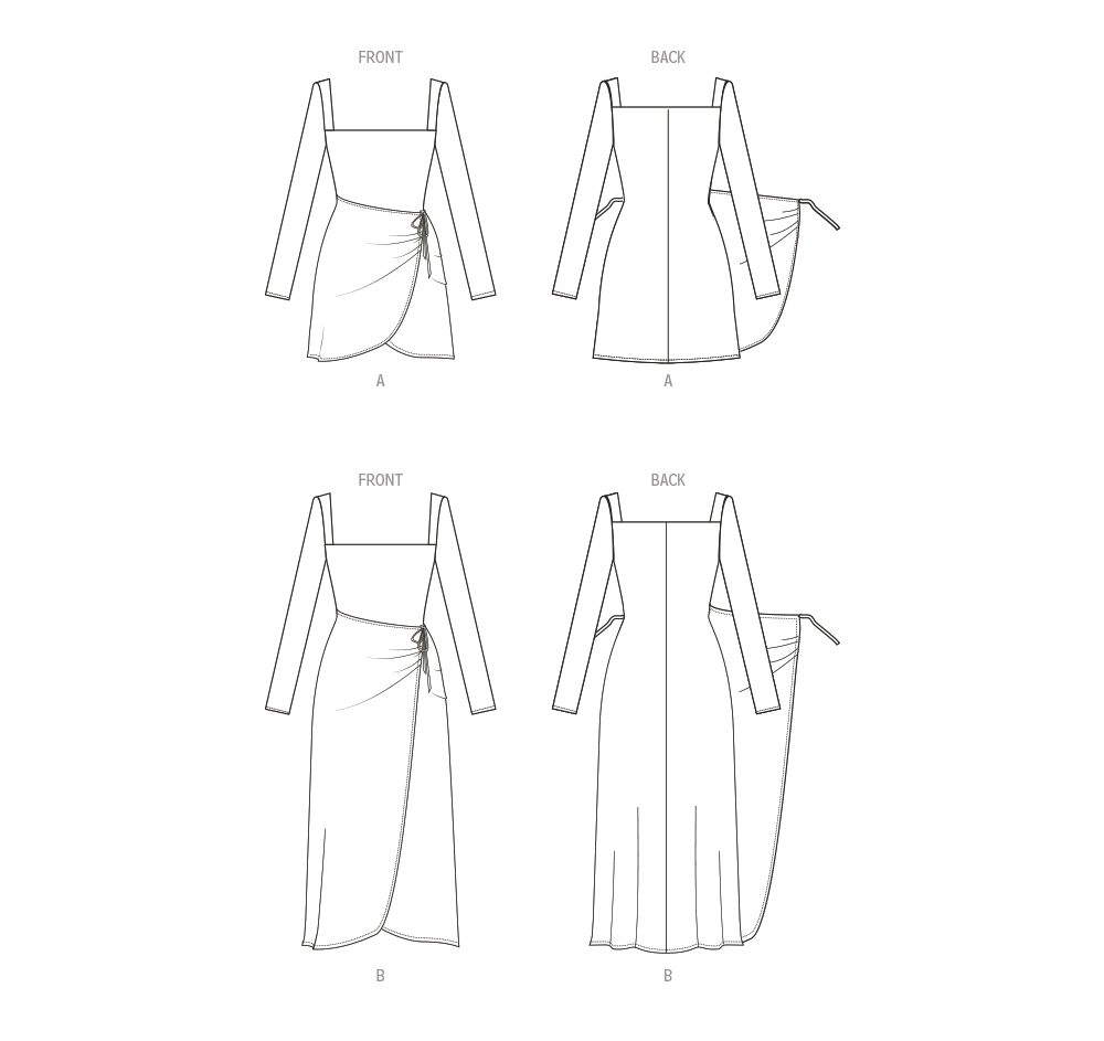 Langärmeliges Wickelkleid in zwei Längen mit quadratischem Ausschnitt, BH-Träger, schmalem Rocksaum und Selbstbindern.
