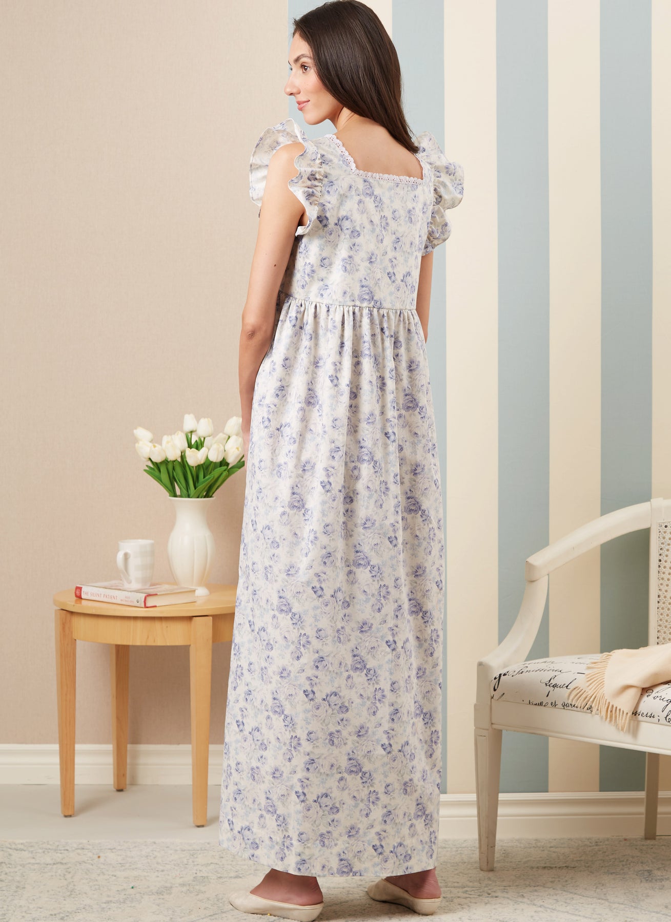 Langer Morgenmantel im Vintage-Stil aus den 1980er Jahren mit V-Ausschnitt und Bindeband, Kragen mit selbstgestrickter Rüsche, Taschen in den Seitennähten, geknöpfter Vorderöffnung, selbstgestricktem Bindegürtel und langen Ärmeln mit gerafften Kappen, die Manschetten mit Rüschen haben. Langes, hochtailliertes, gerafftes Pullover-Nachthemd mit quadratischem Halsausschnitt mit eingekaufter Rüsche, Armausschnittrüschen und Knopfleiste. Robe und Nachthemd haben abgesteppte Säume. Authentische Vintage-Reproduktion mit zusätzlichen Größenoptionen und Schnittmustern.
