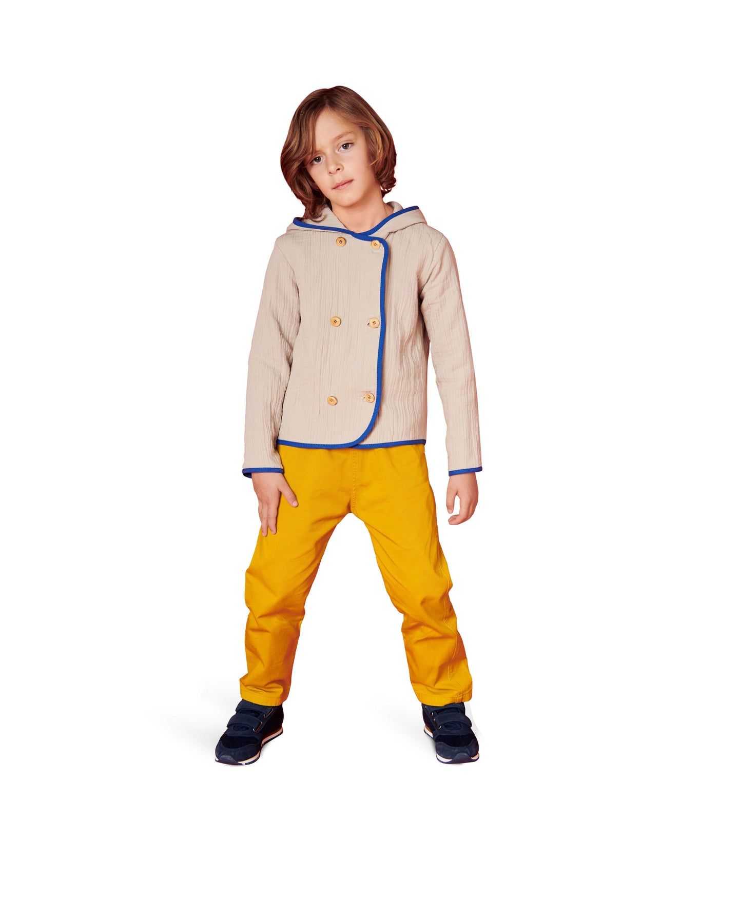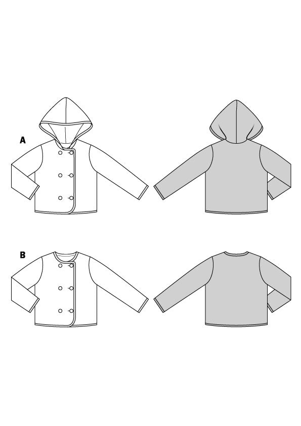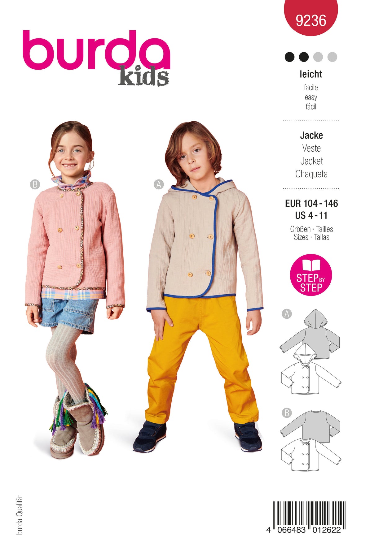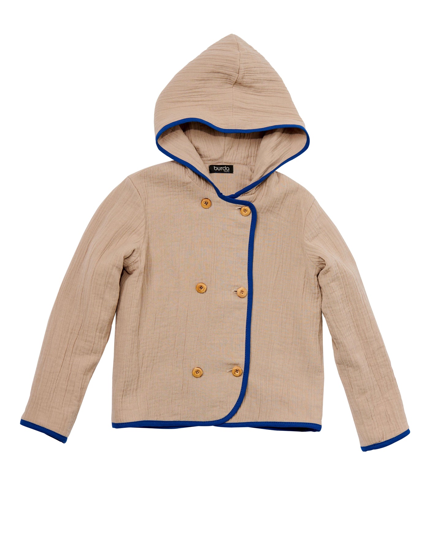 Für Mädchen und Jungen gleichermaßen geeignet sind diese leichten Jacken mal mit, mal ohne Kapuze. Die Kanten werden mit kontrastfarbenem Schrägband eingefasst. Die gedoppelten Jacken werden mit Knöpfen geschlossen.