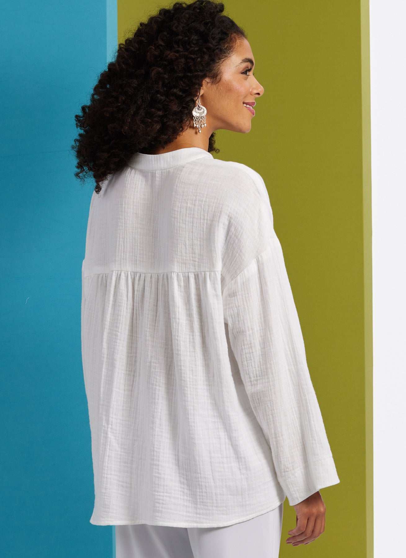 Sehr locker sitzendes Oberteil oder Tunika mit überschnittenen Schultern, langen Ärmeln, Nackenband, Knopfverschluss vorne und Variationen bei Länge und Saum. Ansicht A hat eine vordere Knopfleiste. Ansicht B weist ein vorderes Band und einen hochgeschlossenen Saum auf.