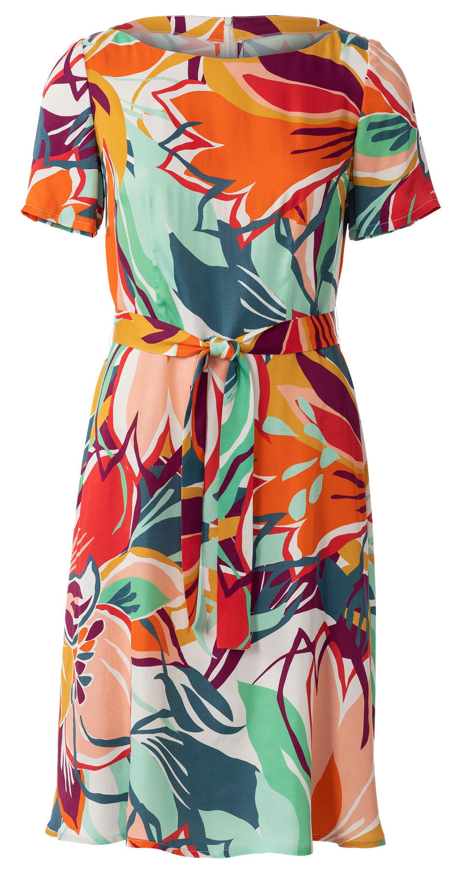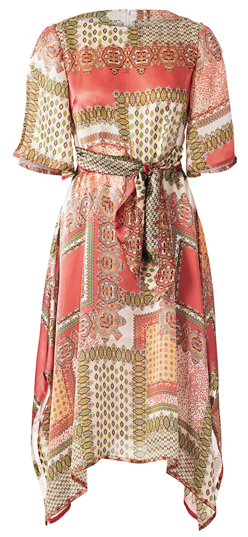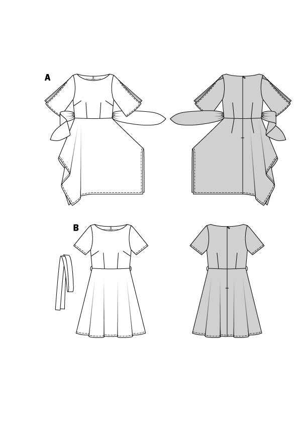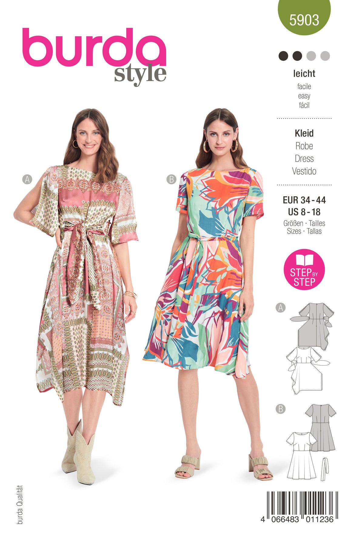 Unkompliziert zu Tragen und zu Nähen sind diese luftigen Kleider die angesagte Prints bestens zur Geltung bringen. A mit raffiniertem Zipfelrock, oben geschlitzten Ärmeln und Bindebändern in der Taille. B schlichter mit ausgestelltem Rock, kurzen Ärmeln und Extra-Bindegürtel.