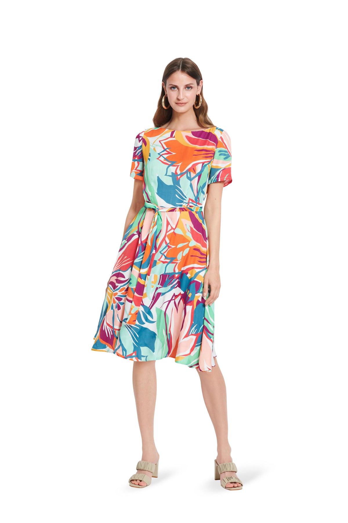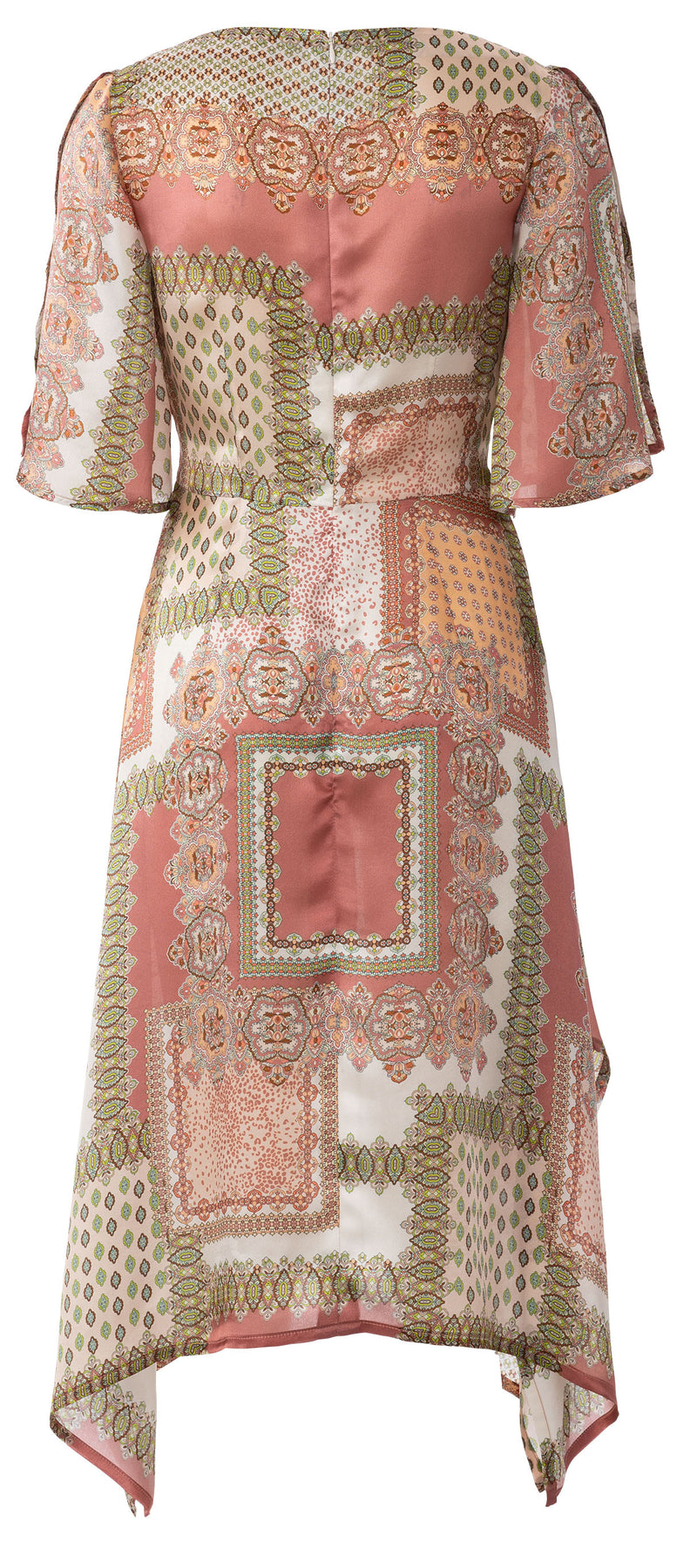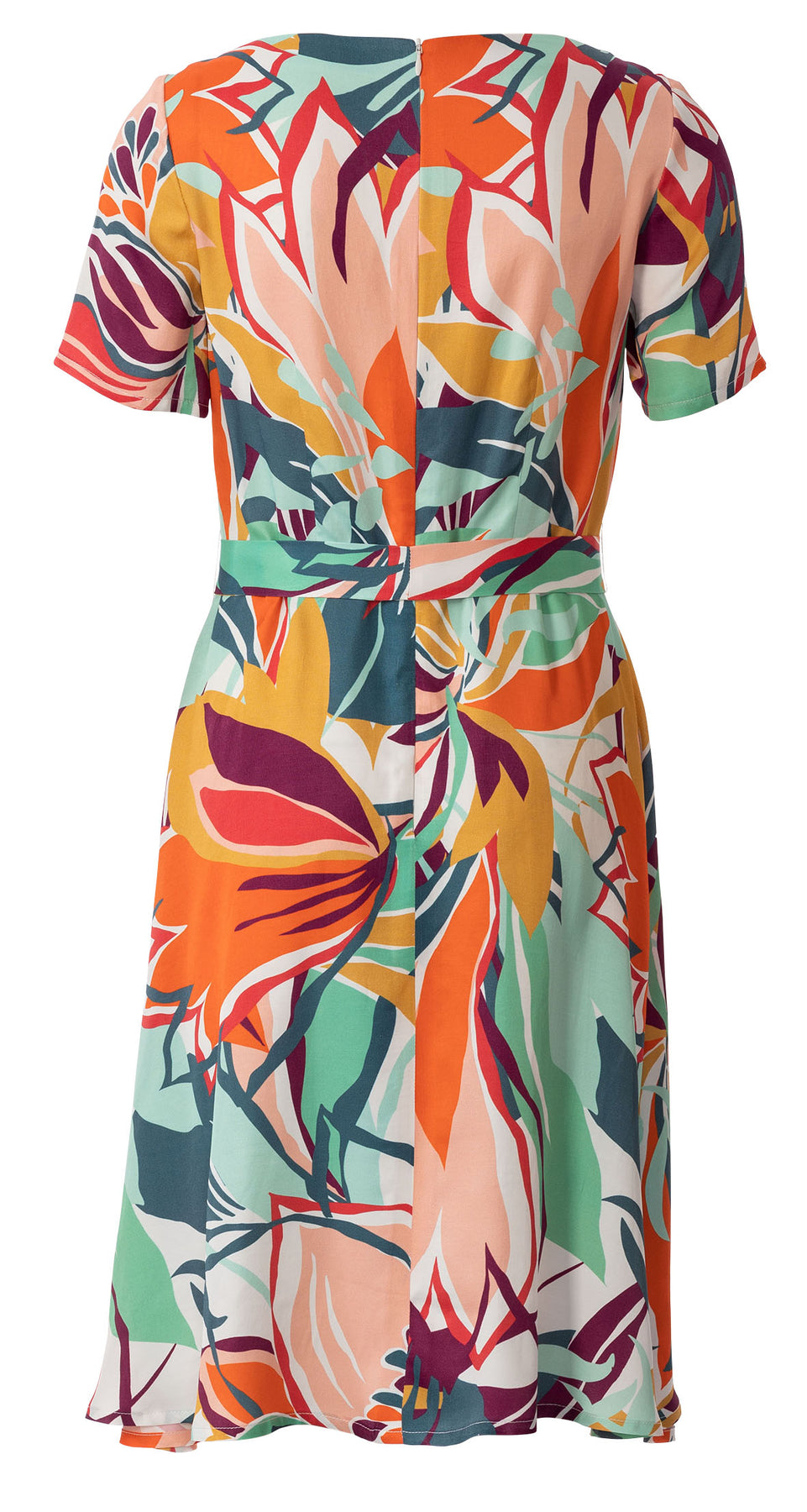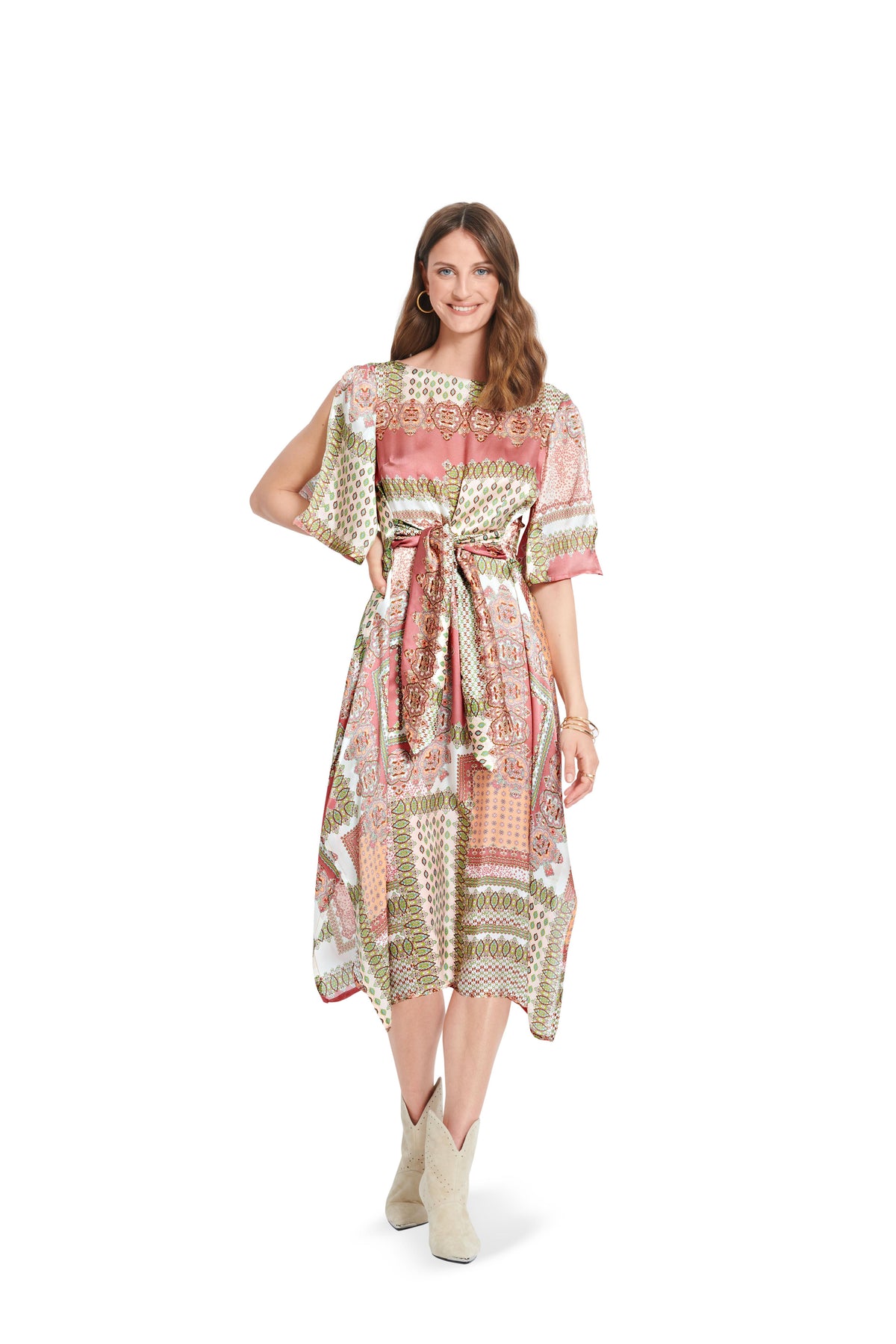 Unkompliziert zu Tragen und zu Nähen sind diese luftigen Kleider die angesagte Prints bestens zur Geltung bringen. A mit raffiniertem Zipfelrock, oben geschlitzten Ärmeln und Bindebändern in der Taille. B schlichter mit ausgestelltem Rock, kurzen Ärmeln und Extra-Bindegürtel.