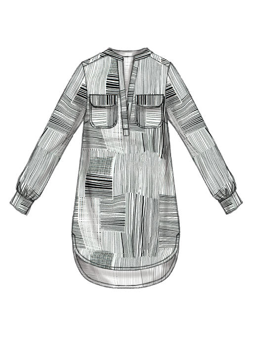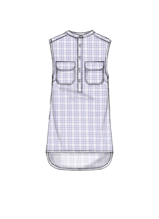 Locker sitzende Pullover-Tops mit Nacken- und Vorderbündchen, hinten in Bügelfalten gelegt, mit vorgezogenen Schulternähten, ohne Schulternähte, mit Saumvariationen und schmalem Saum. A: Seitenschlitze. B: Schräge Armlochbelege. C: Knopfleisten. A, B, D: Taschen. B, D: Klappen. A, C, D: Zweiteilige Ärmel. C, D: Nahtöffnung an den Ärmeln, Knopfmanschetten. Aufgerollte Ärmel C, und Saum B, D: Falsche Seite zeigt. Entworfen für mittelschwere Webstoffe.